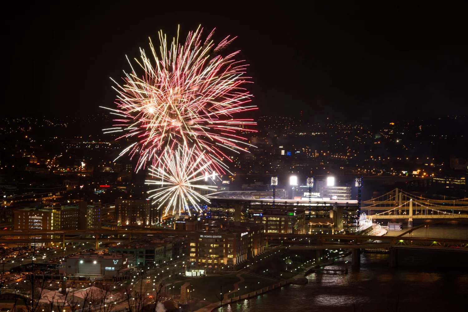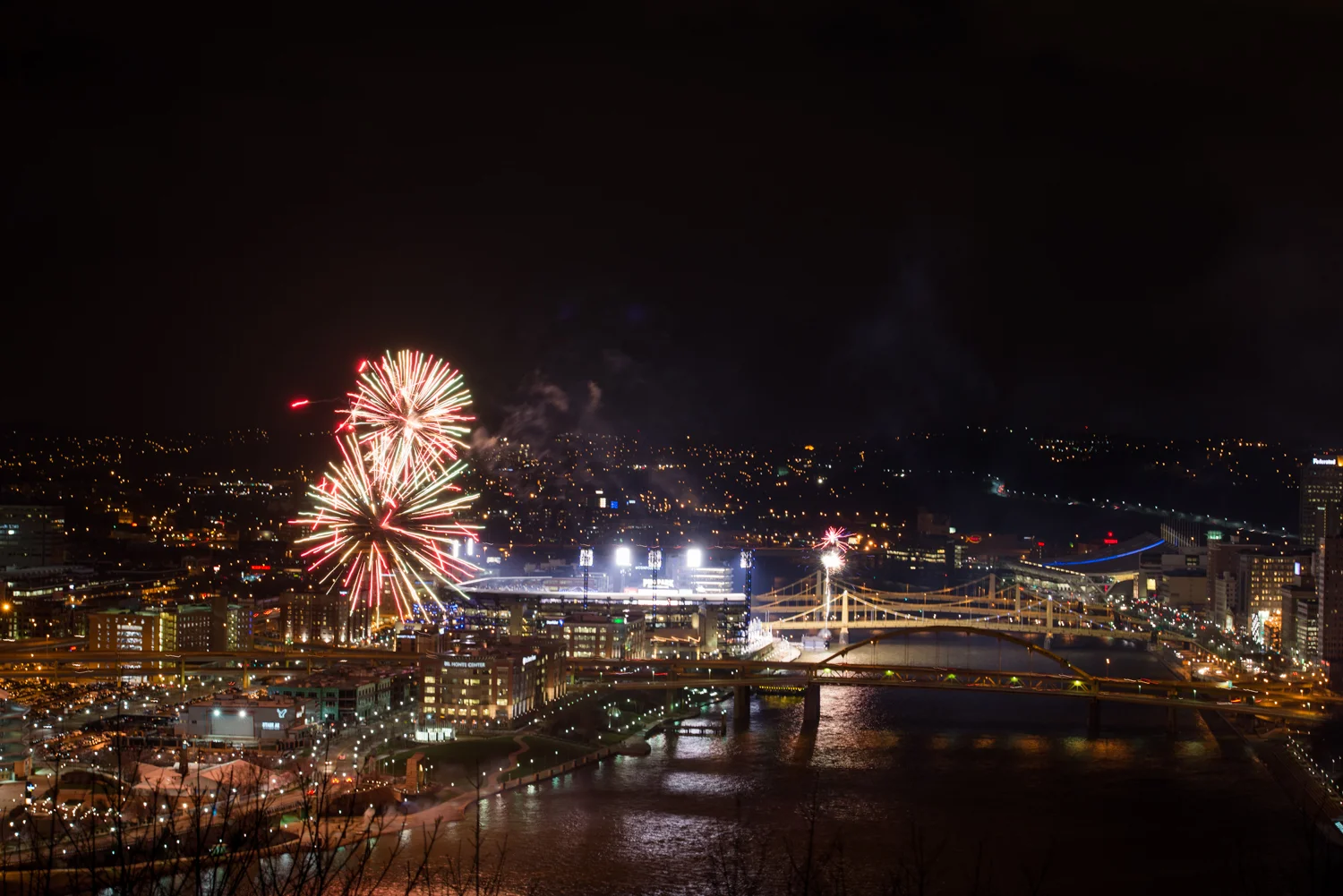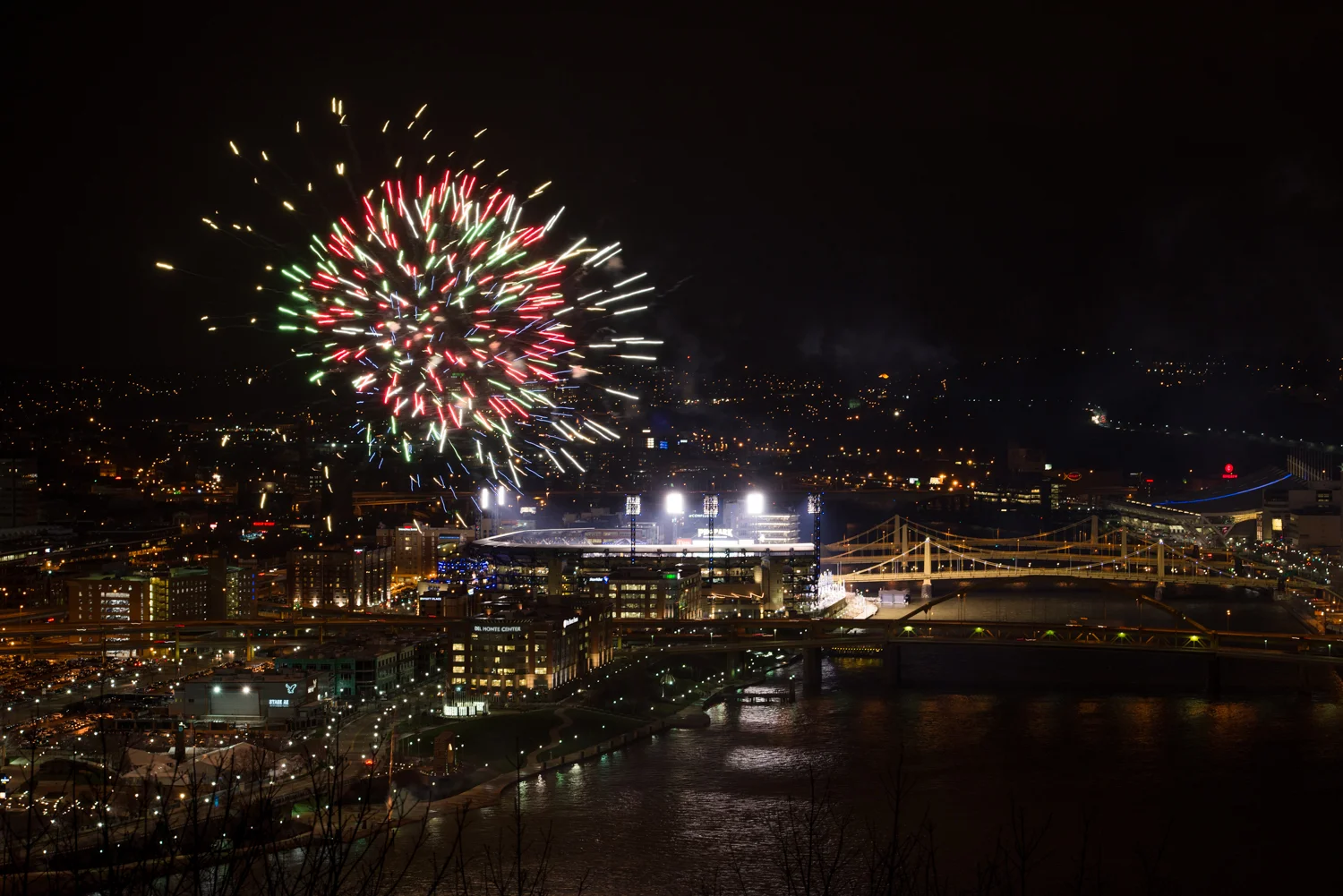 Without a doubt one of the best surprises that night were the fireworks! We had seen a few go off from the area of PNC park, but these only lasted a few seconds. Not long before we were thinking of moving on, a large string of fireworks began from a different area, and continued for a few minutes! We did our best to make the change quickly, switching our long shutter speeds and low ISO’s (which were set for long exposures of the city) to match the light of the fireworks.