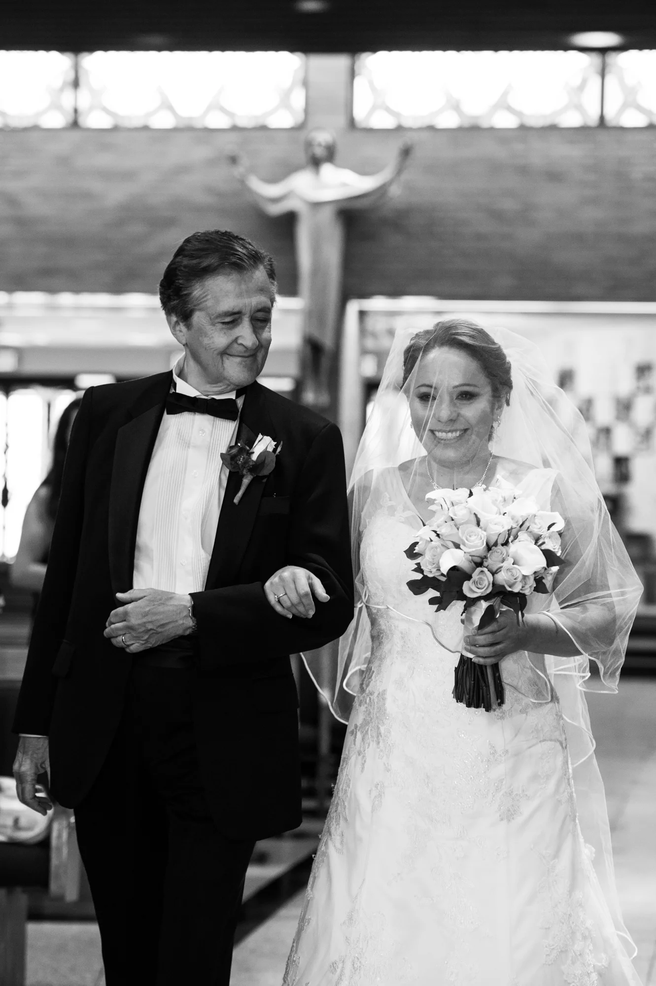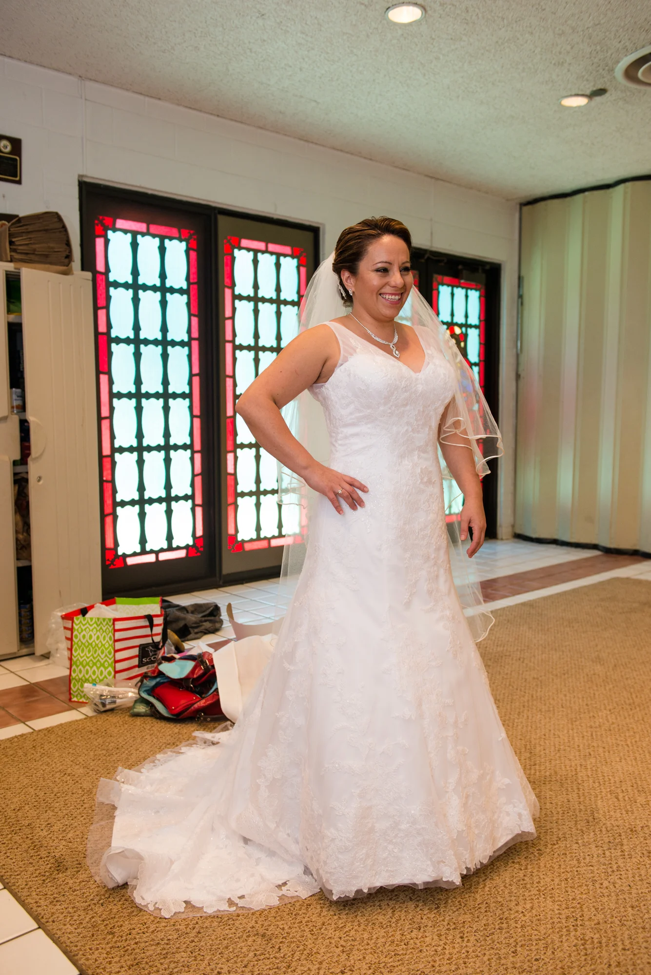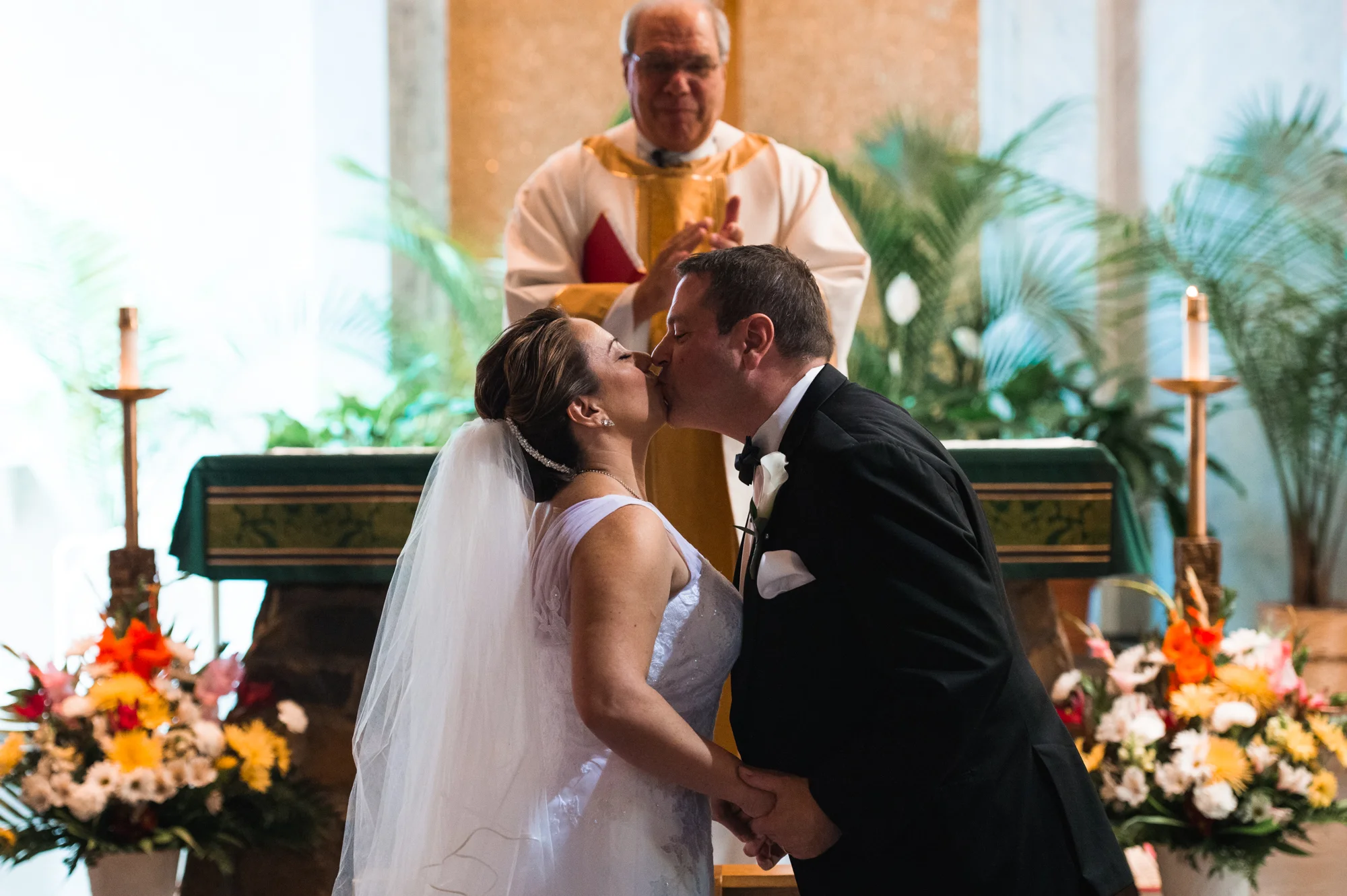 In the case of Peter and Ximena’s wedding, when I walked in to the Church of the Nativity in Burke Virginia, I knew immediately that I wanted to feature the couple with the stained glass windows. This wasn’t just a small window off to the side or at the front of the church, this window took up almost an entire wall, casting beams of beautifully intricate colored lights into the church.