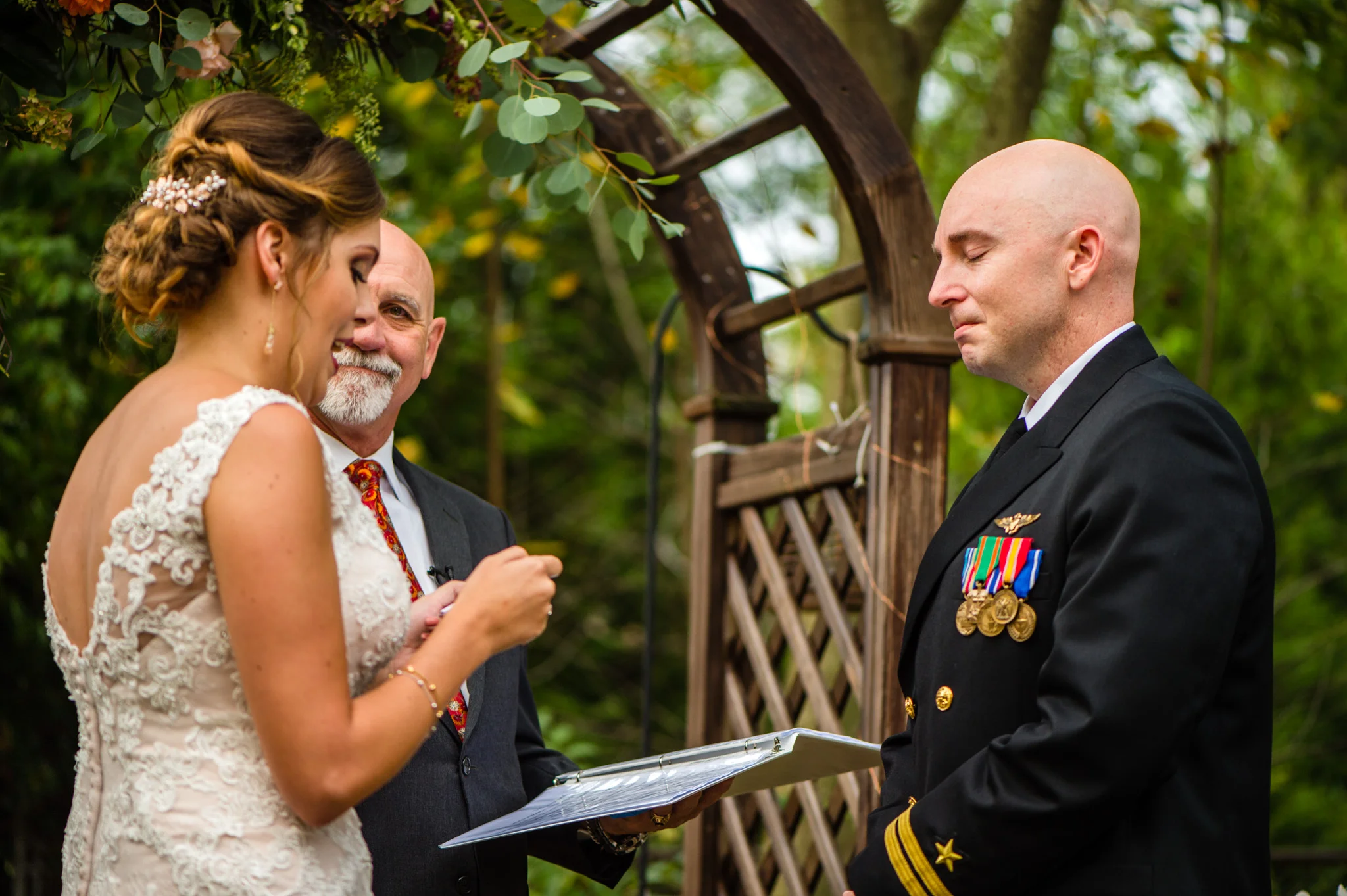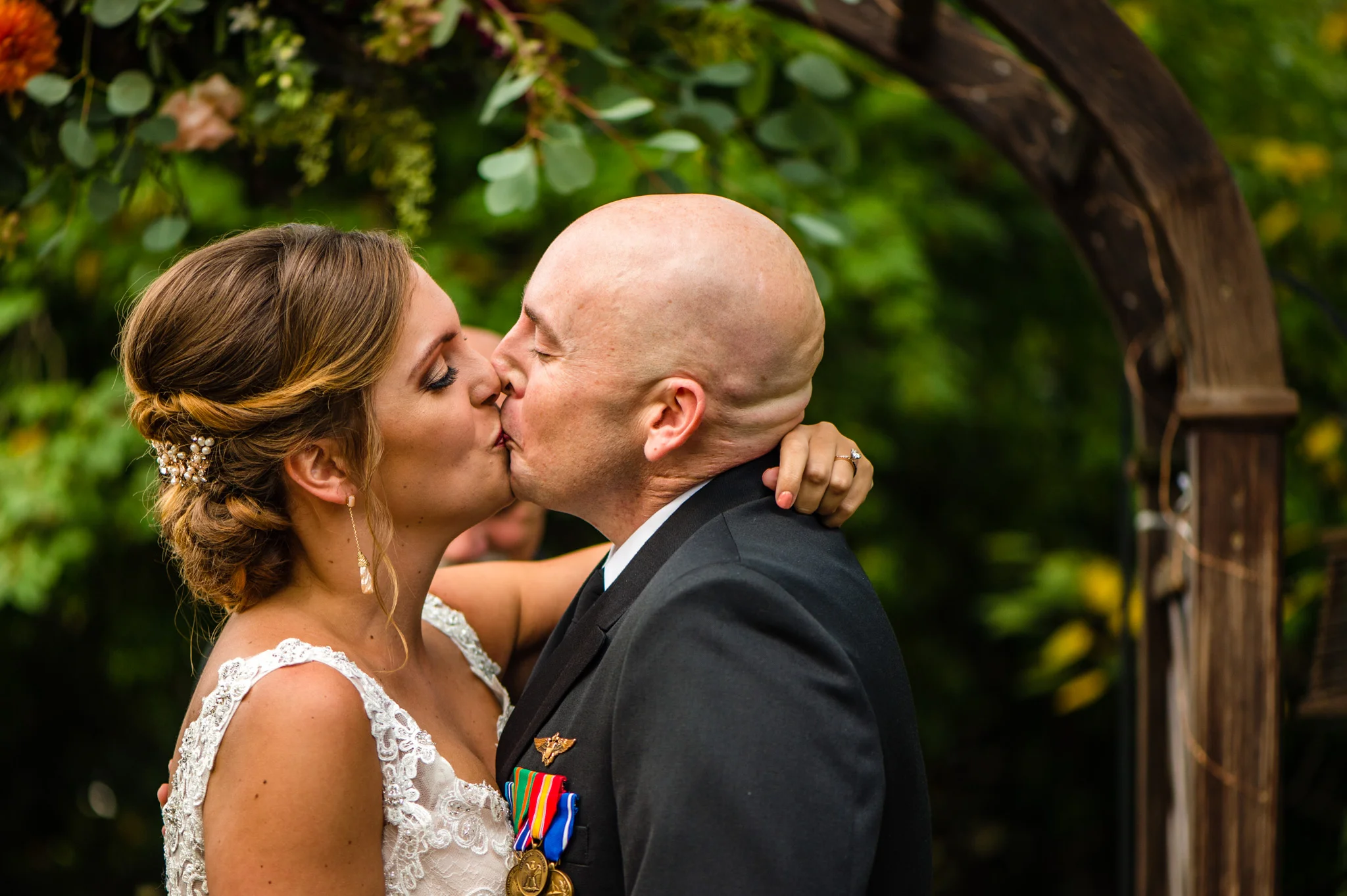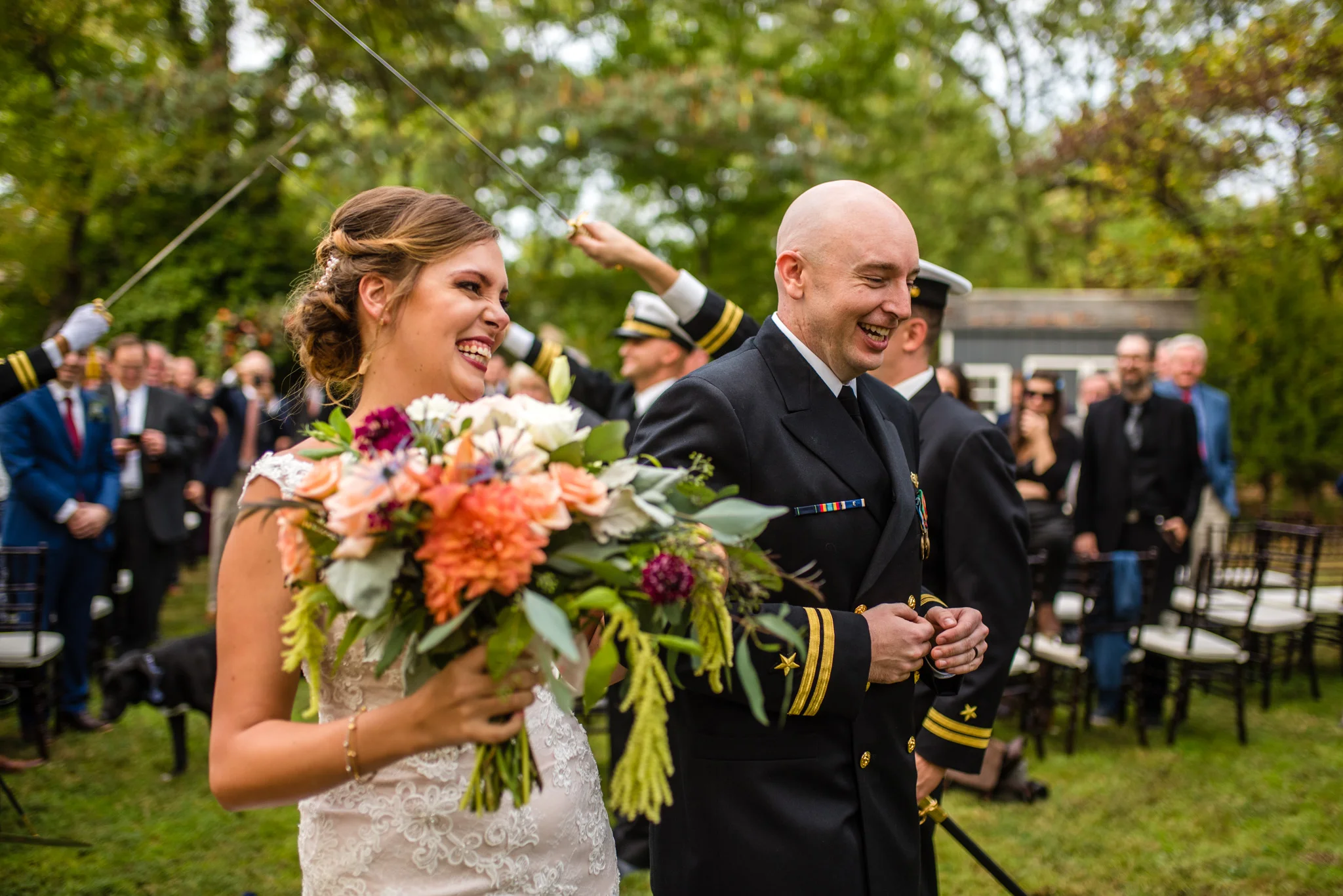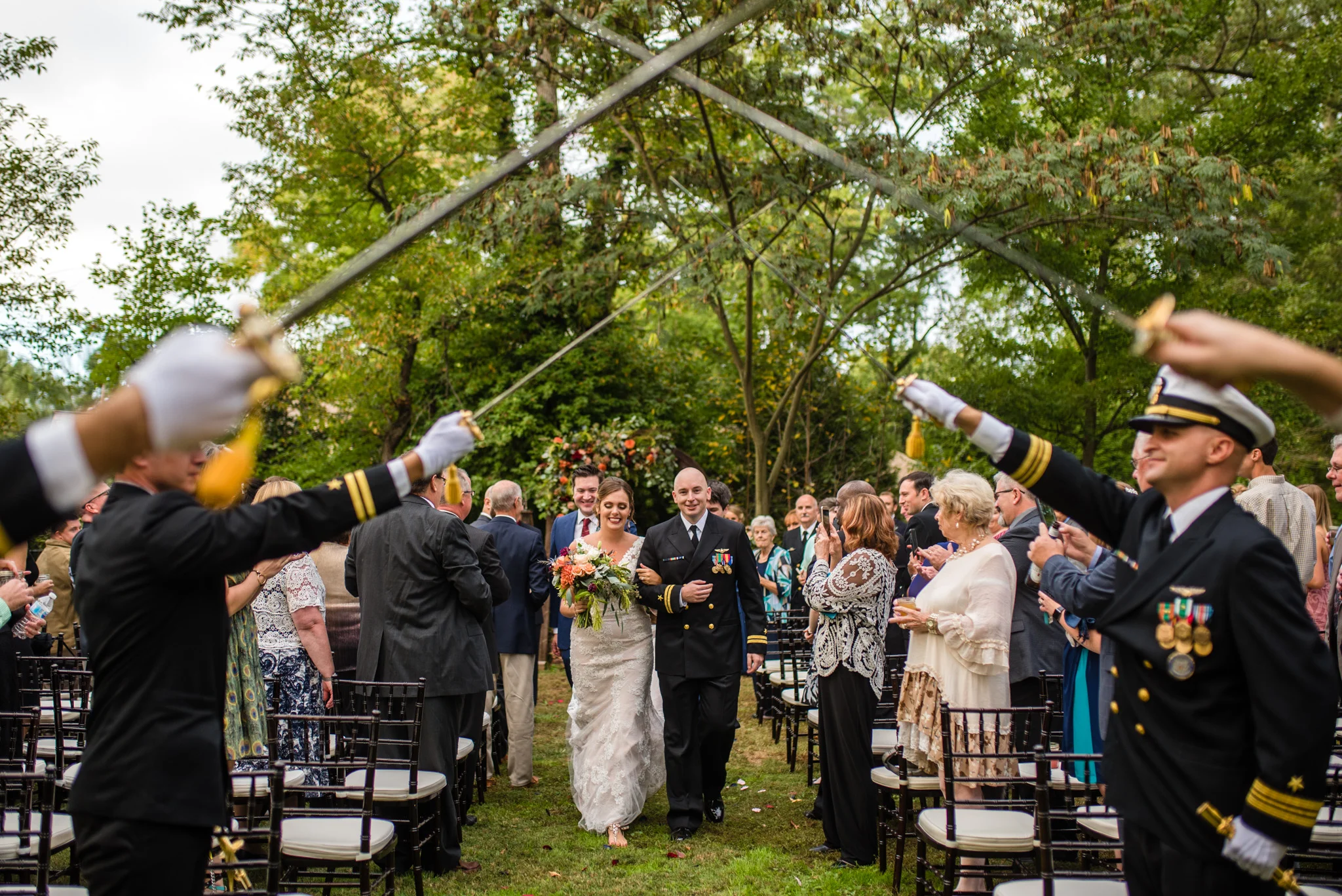 Andrew is a member of the Navy and wore his dress blues for the ceremony. At the end when he and Kristen walked back down the aisle after their first kiss their way was ceremonially blocked by four Navy brothers in blues blocking the way with swords! Fortunately, all that was needed to get by was a kiss.