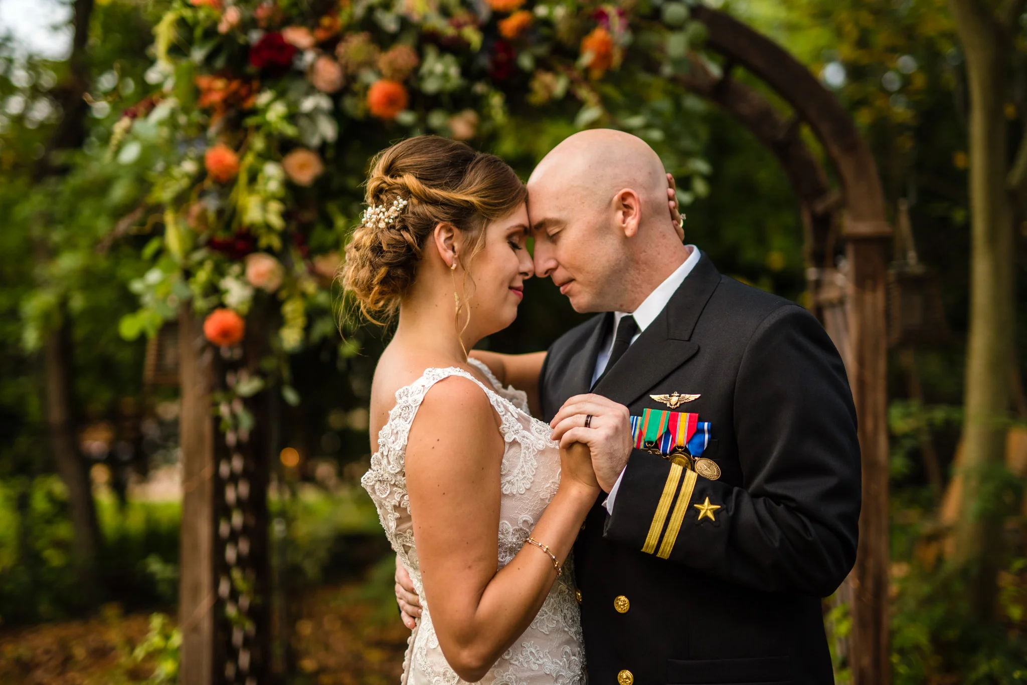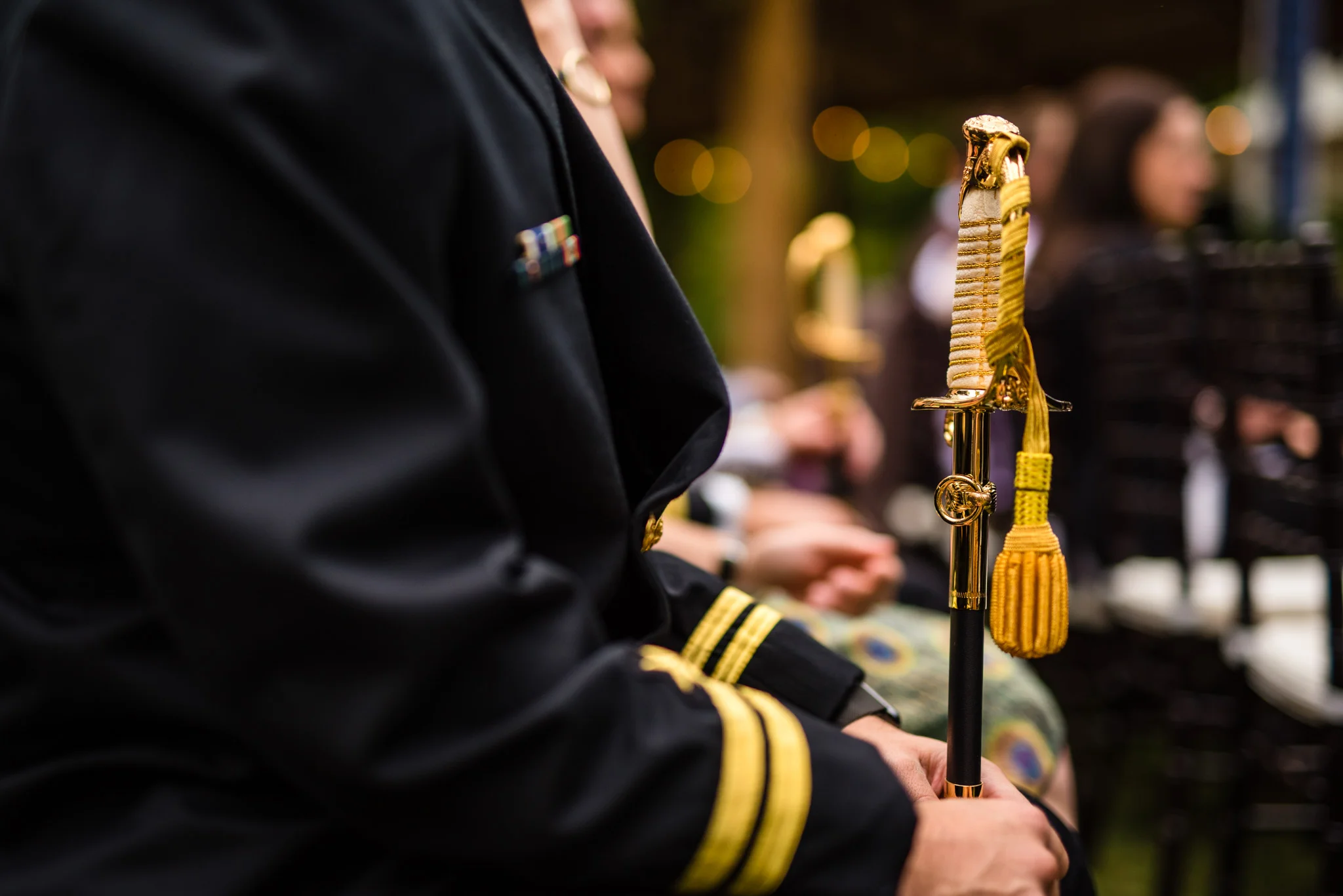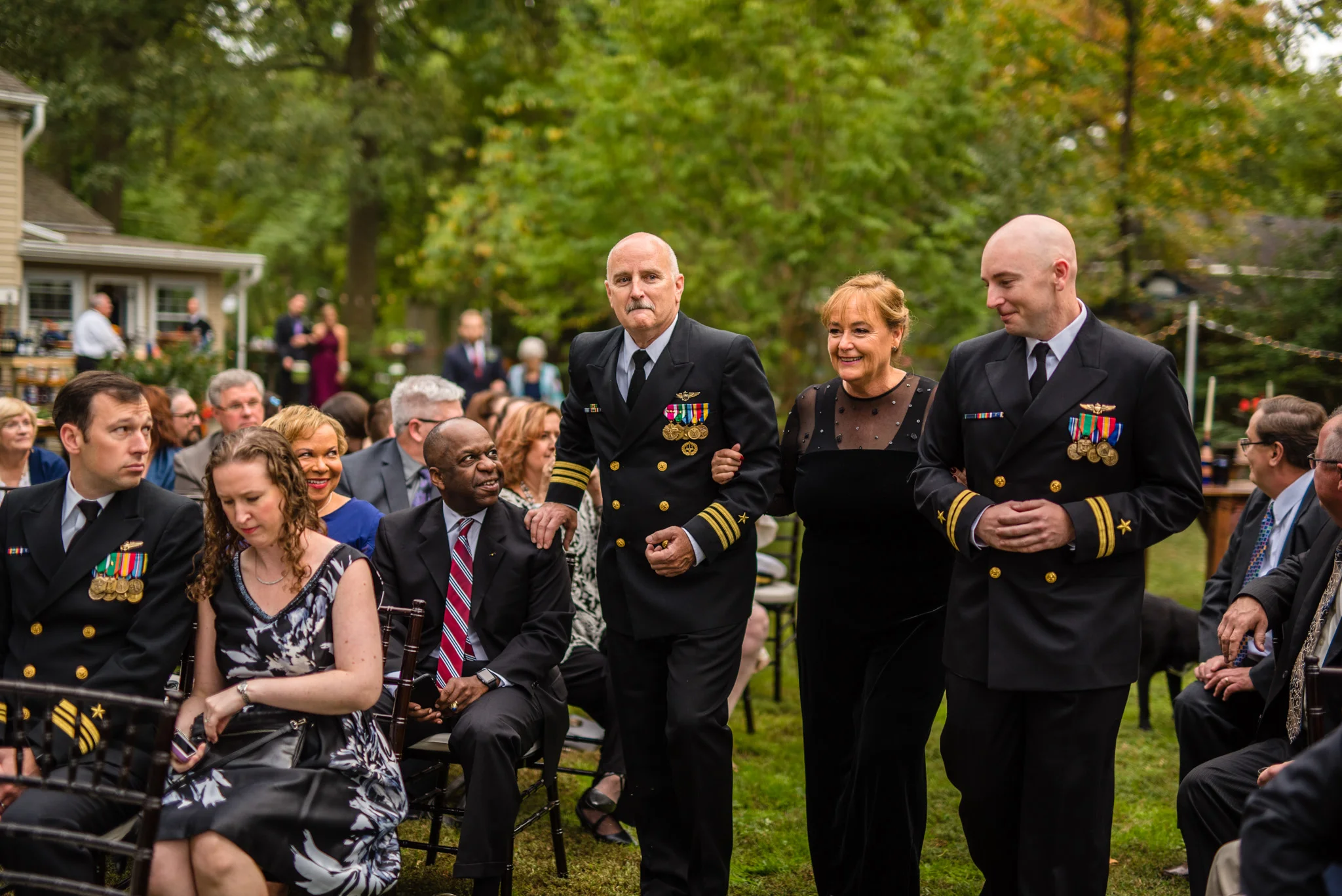 Andrew is a member of the Navy and wore his dress blues for the ceremony. At the end when he and Kristen walked back down the aisle after their first kiss their way was ceremonially blocked by four Navy brothers in blues blocking the way with swords! Fortunately, all that was needed to get by was a kiss.
