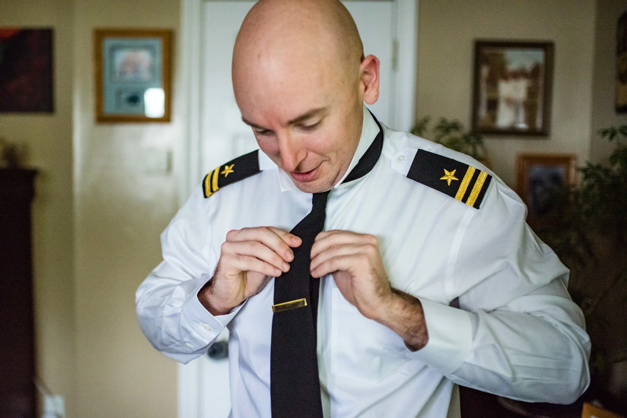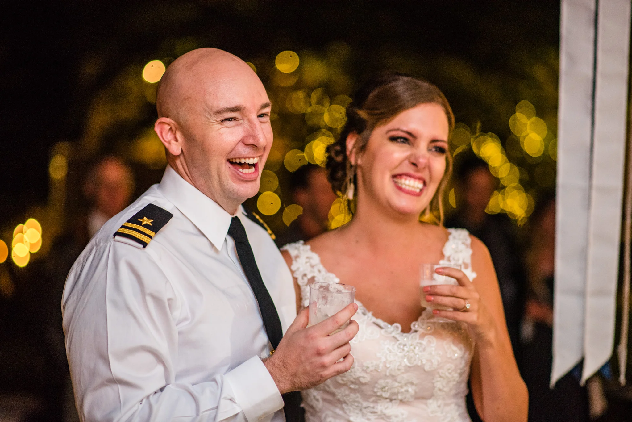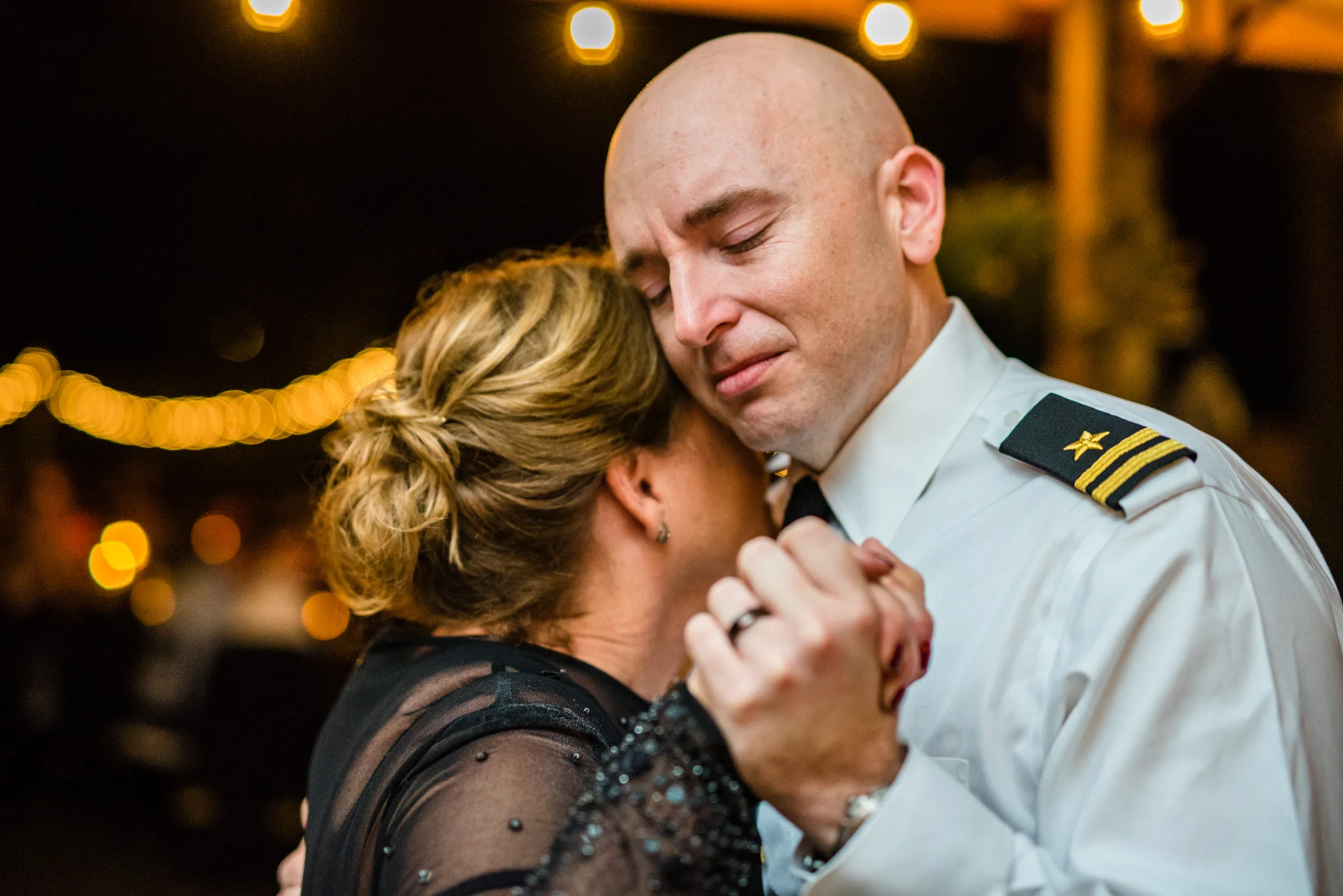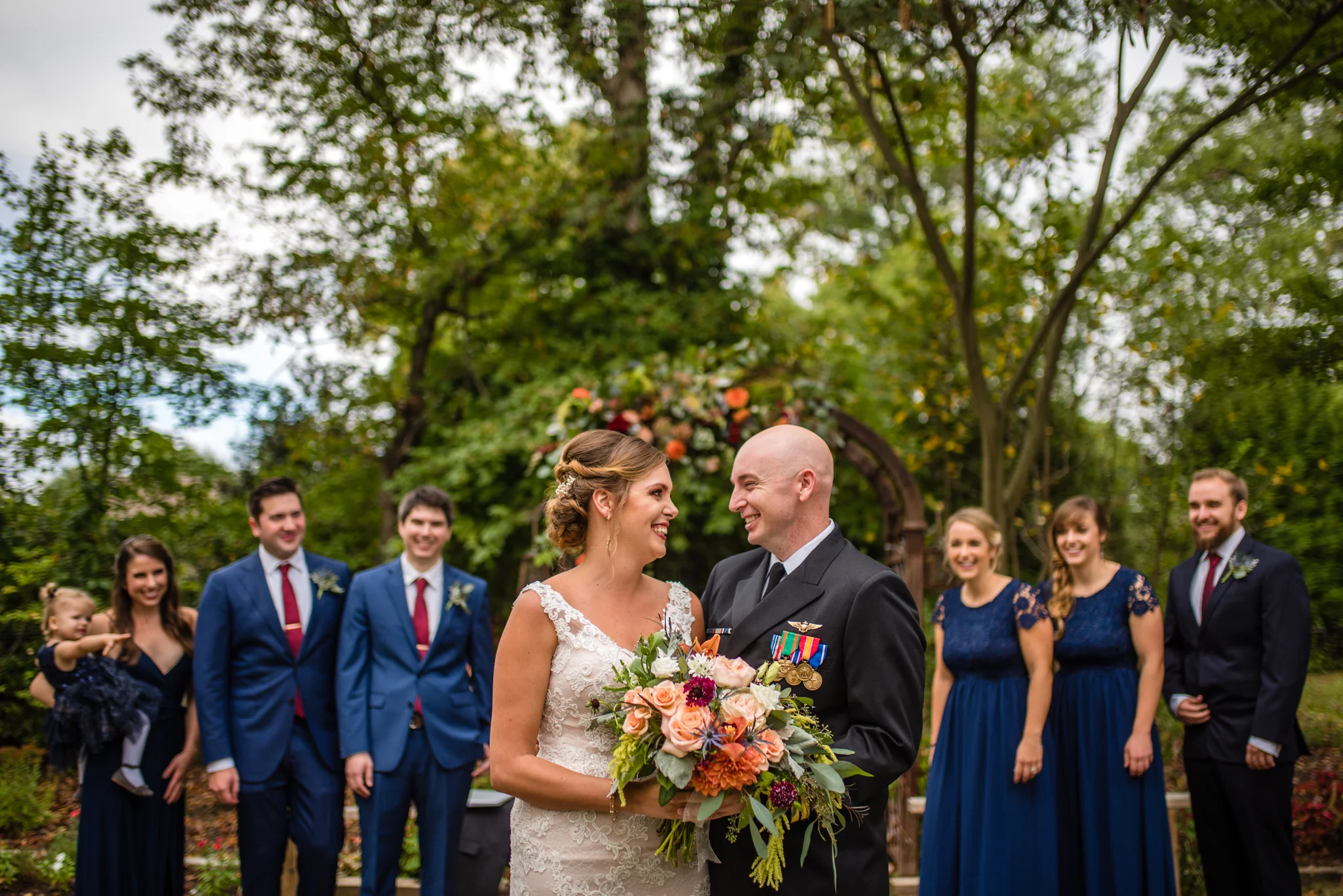 Andrew is a member of the Navy and wore his dress blues for the ceremony. At the end when he and Kristen walked back down the aisle after their first kiss their way was ceremonially blocked by four Navy brothers in blues blocking the way with swords! Fortunately, all that was needed to get by was a kiss.