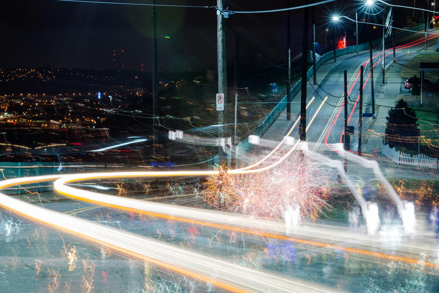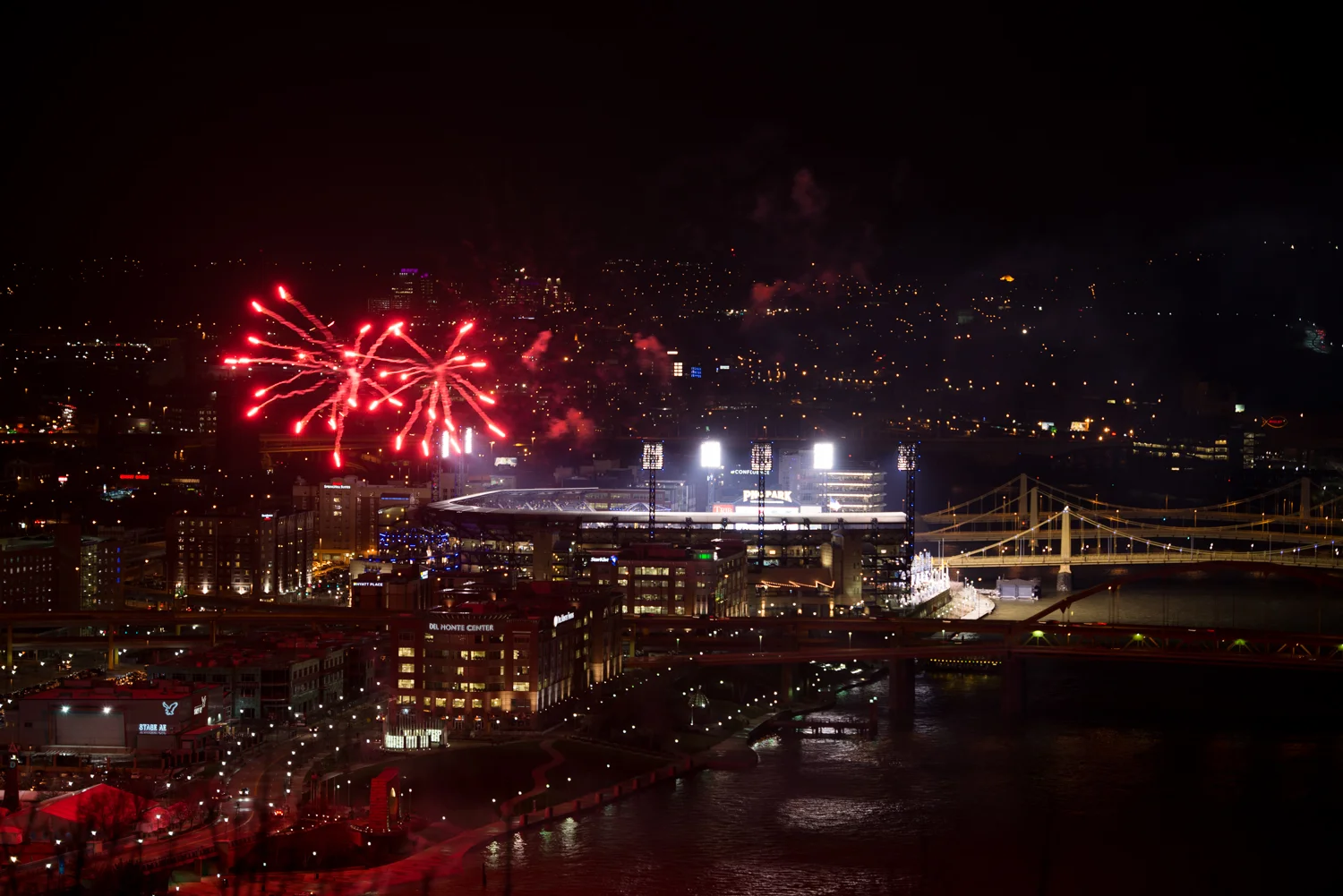 Without a doubt one of the best surprises that night were the fireworks! We had seen a few go off from the area of PNC park, but these only lasted a few seconds. Not long before we were thinking of moving on, a large string of fireworks began from a different area, and continued for a few minutes! We did our best to make the change quickly, switching our long shutter speeds and low ISO's (which were set for long exposures of the city) to match the light of the fireworks.