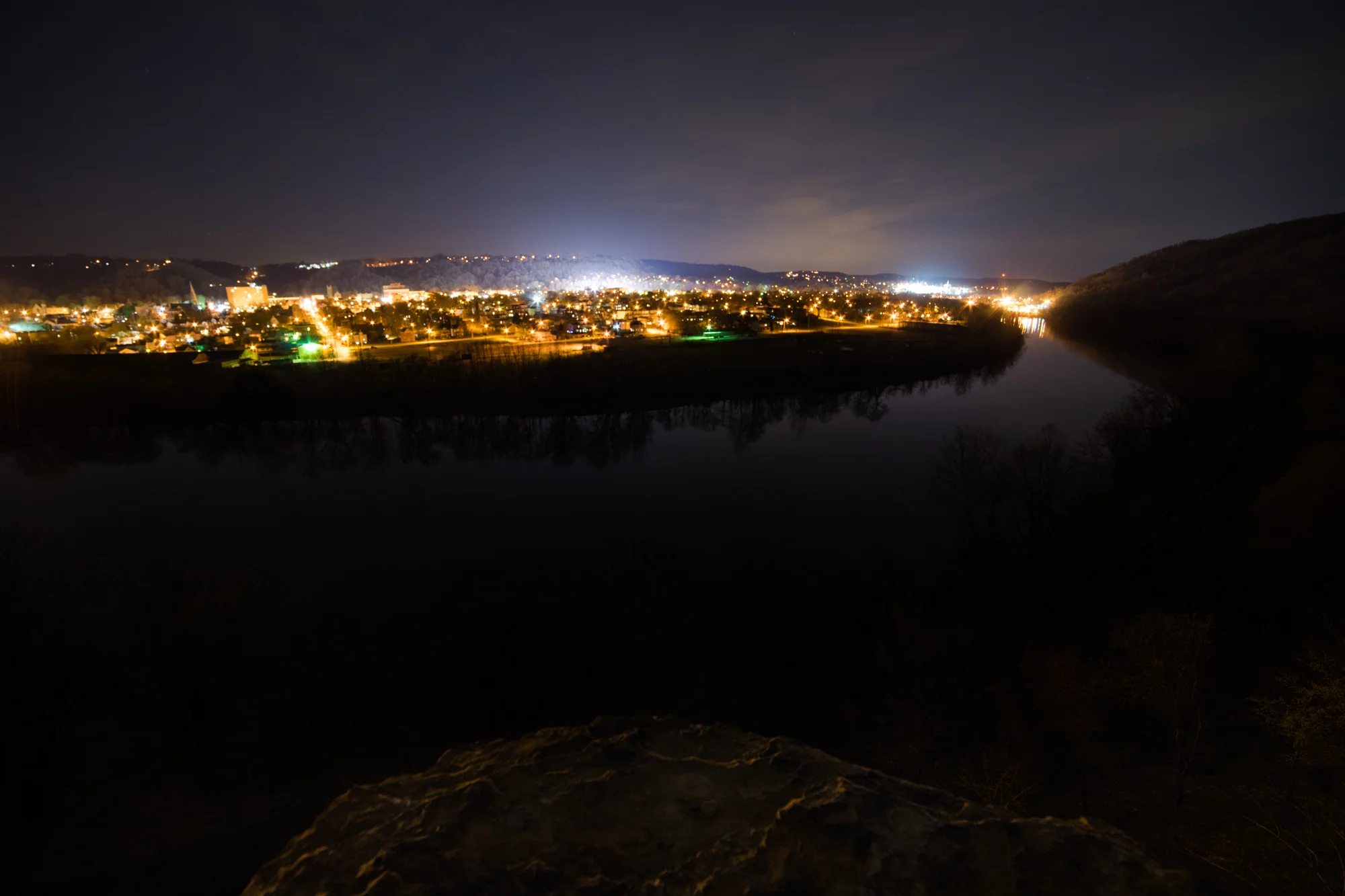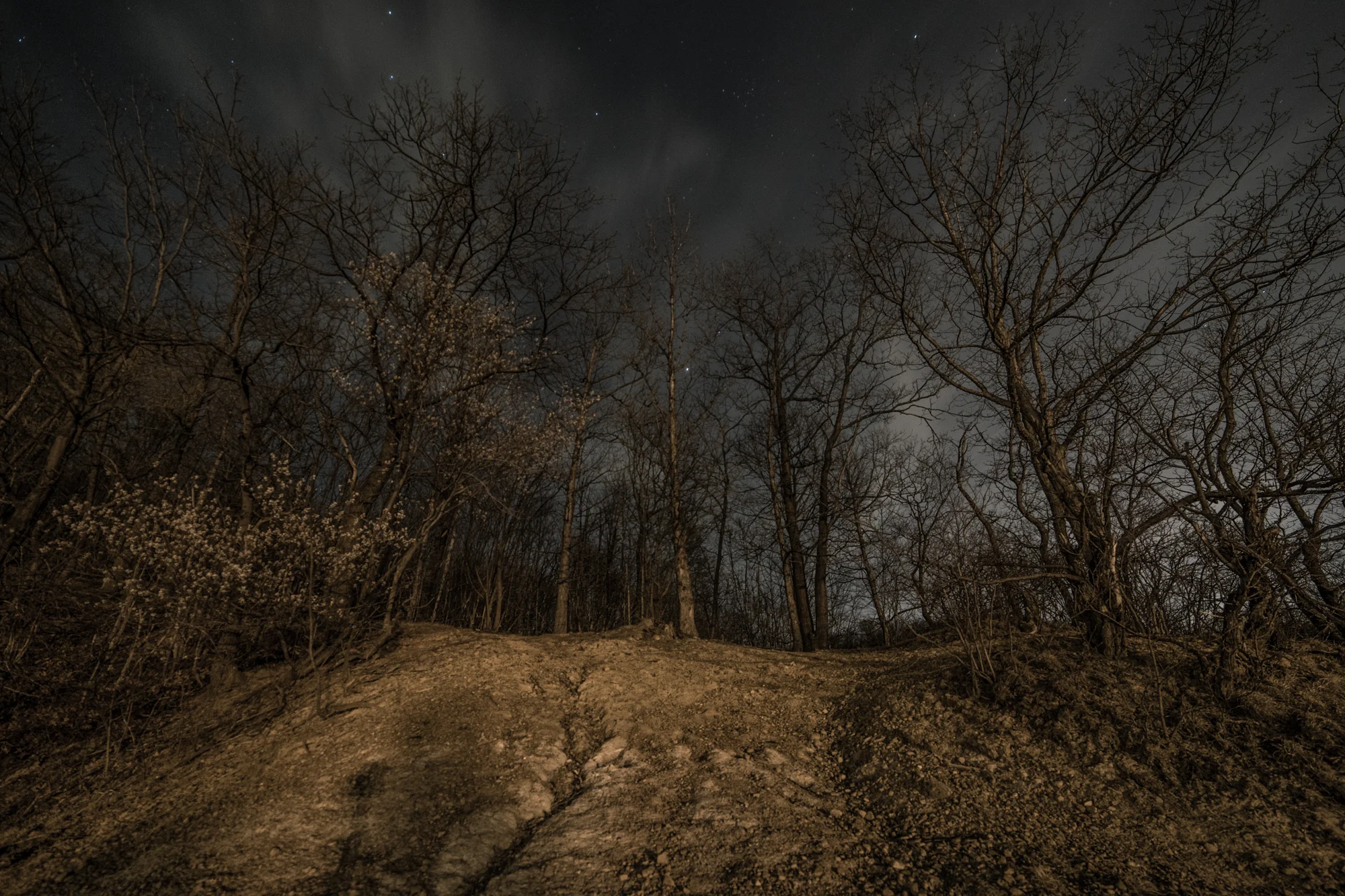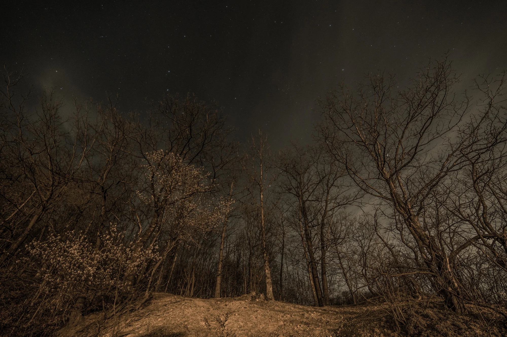 The problem came from having to hike to and from this site in the dark. The fact that Jeff and I forgot to pack flashlights didn't help. We made the hike up at late dusk, so we could see fairly well on the way there, but coming back was much scarier. A steep decent into a tall and cramped ravine, a cross over a creek, and a high climb over loose rocks and dirt up to the rock outcropping were all much more difficult at 11:30 p.m. in complete darkness with lots of camera gear. Our phones provided just enough light to avoid obstacles before we did any face plants.