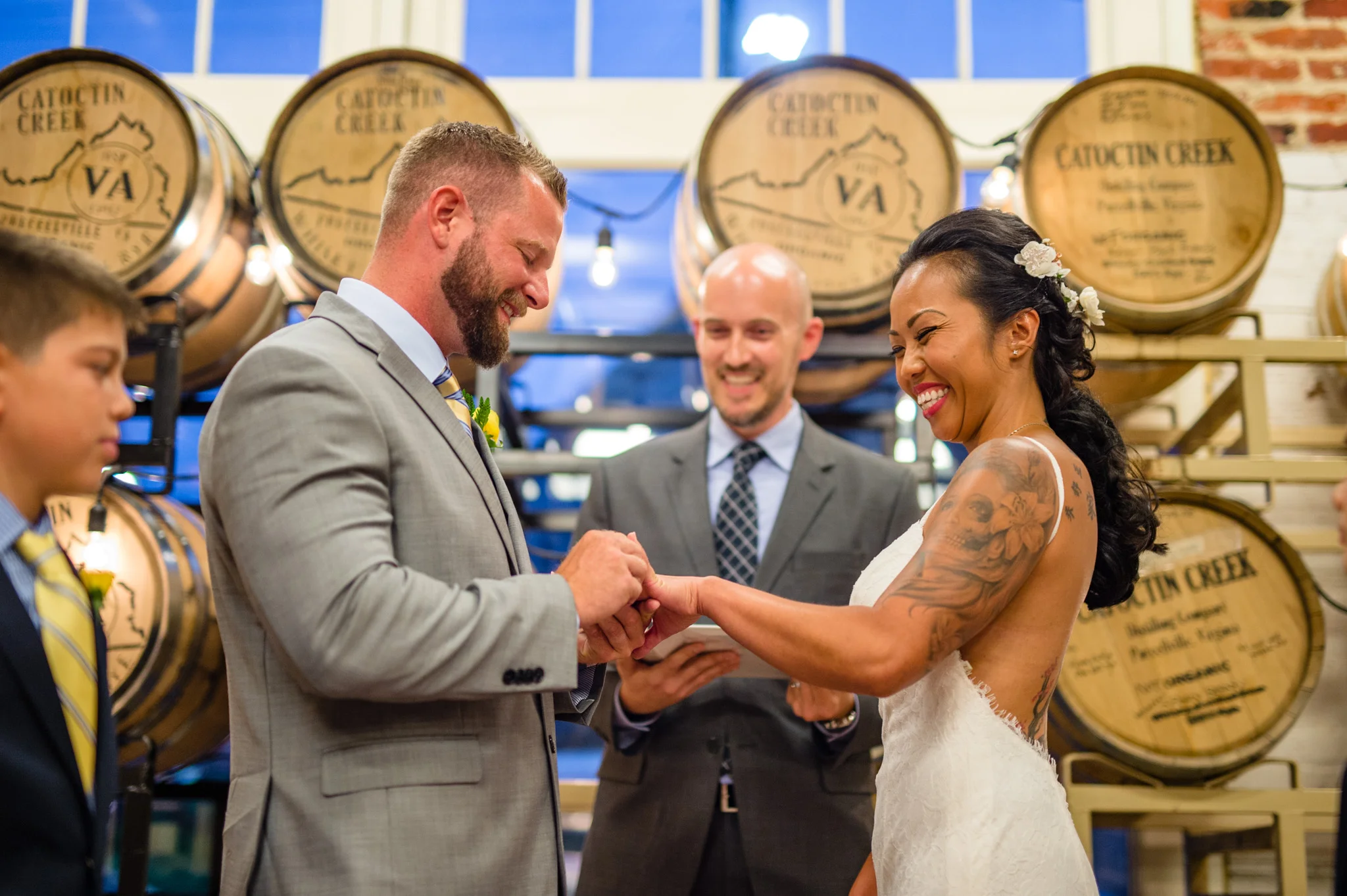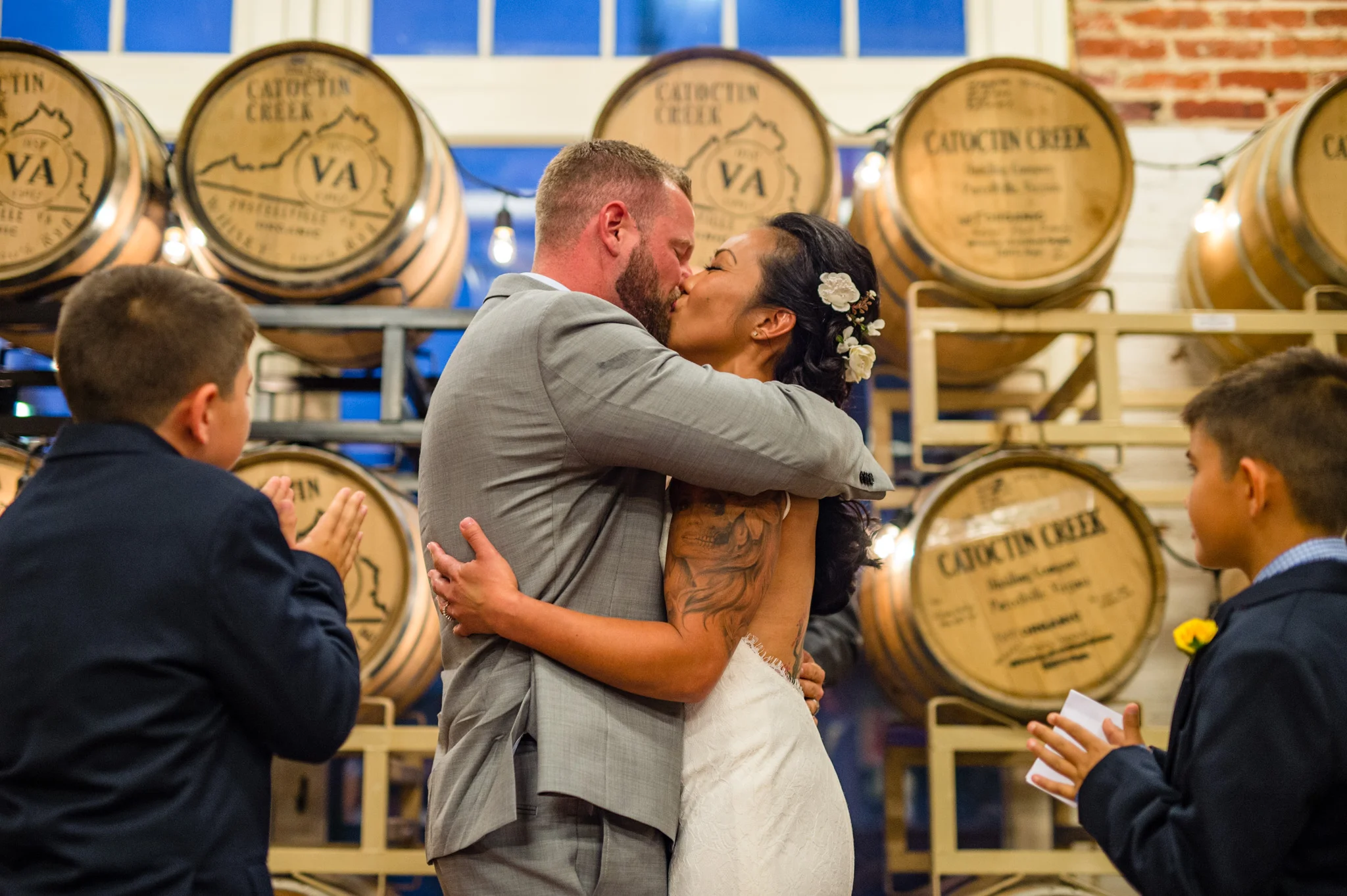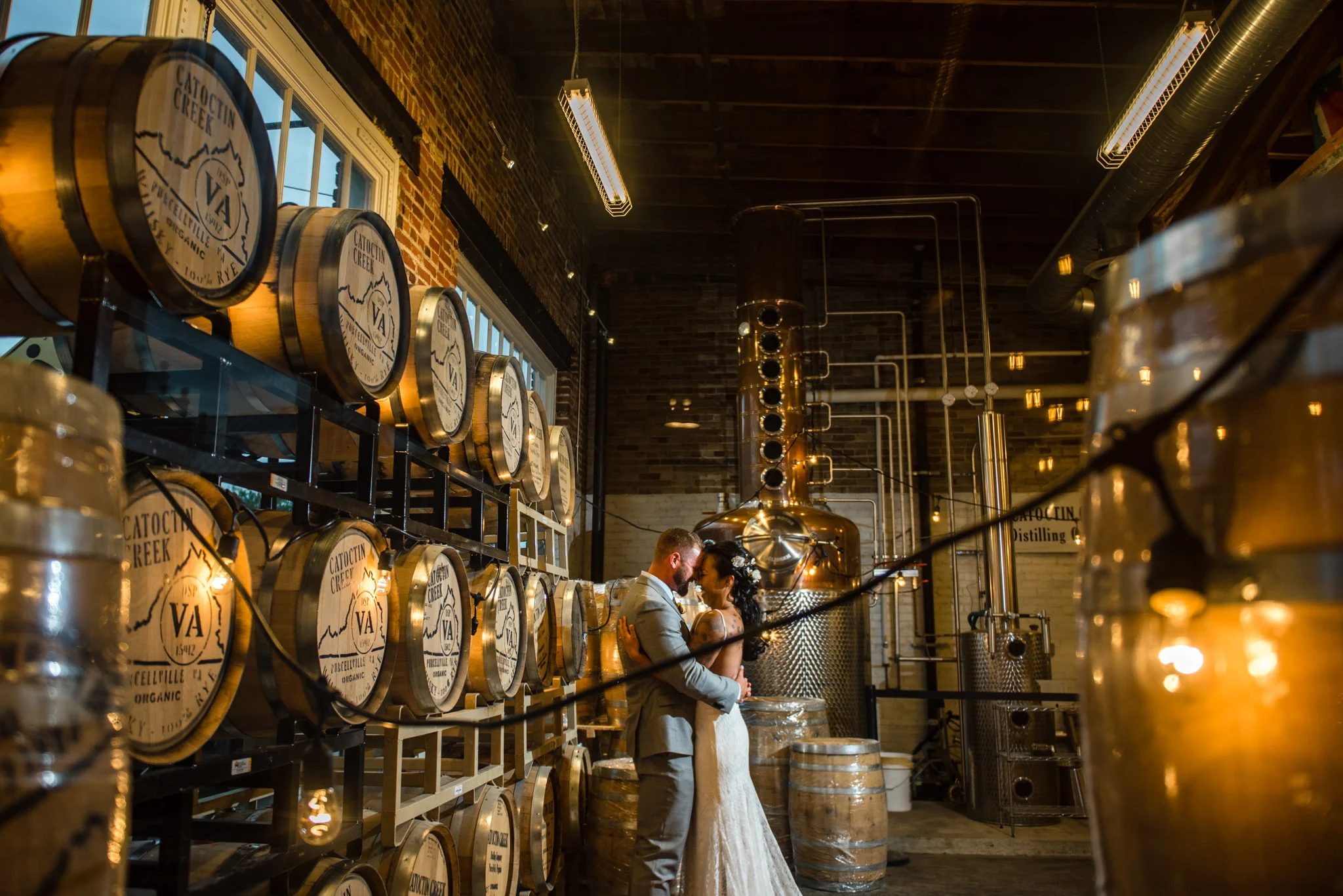 Catoctin Creek Distillery in Purcellville is a very unique place for a wedding event. It is an active distillery, which, fun fact, was founded “in 2009 as the first legal distillery in Loudoun County since before Prohibition.”  I loved capturing portraits around the venue, utilizing the barrels, the machinery, the unique architecture; it was very different from more standard wedding venues.