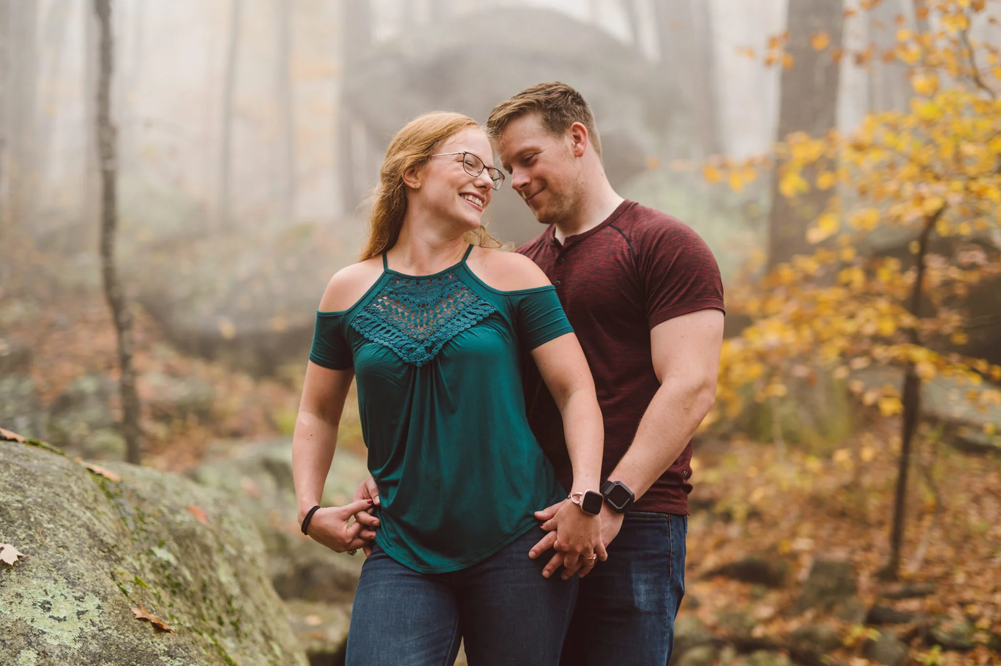 Unfortunately, the day of their session started in complete fog. I was nervous that morning as I drove to Old Rag. When I arrived at the trailhead parking lot, the mountain was covered in thick fog with no end in sight. I was joined by Tim, Jessica, and Stan my associate, as well as his brother David. The five of us started hiking, hoping that the fog would clear to give us the view we were dreaming of.