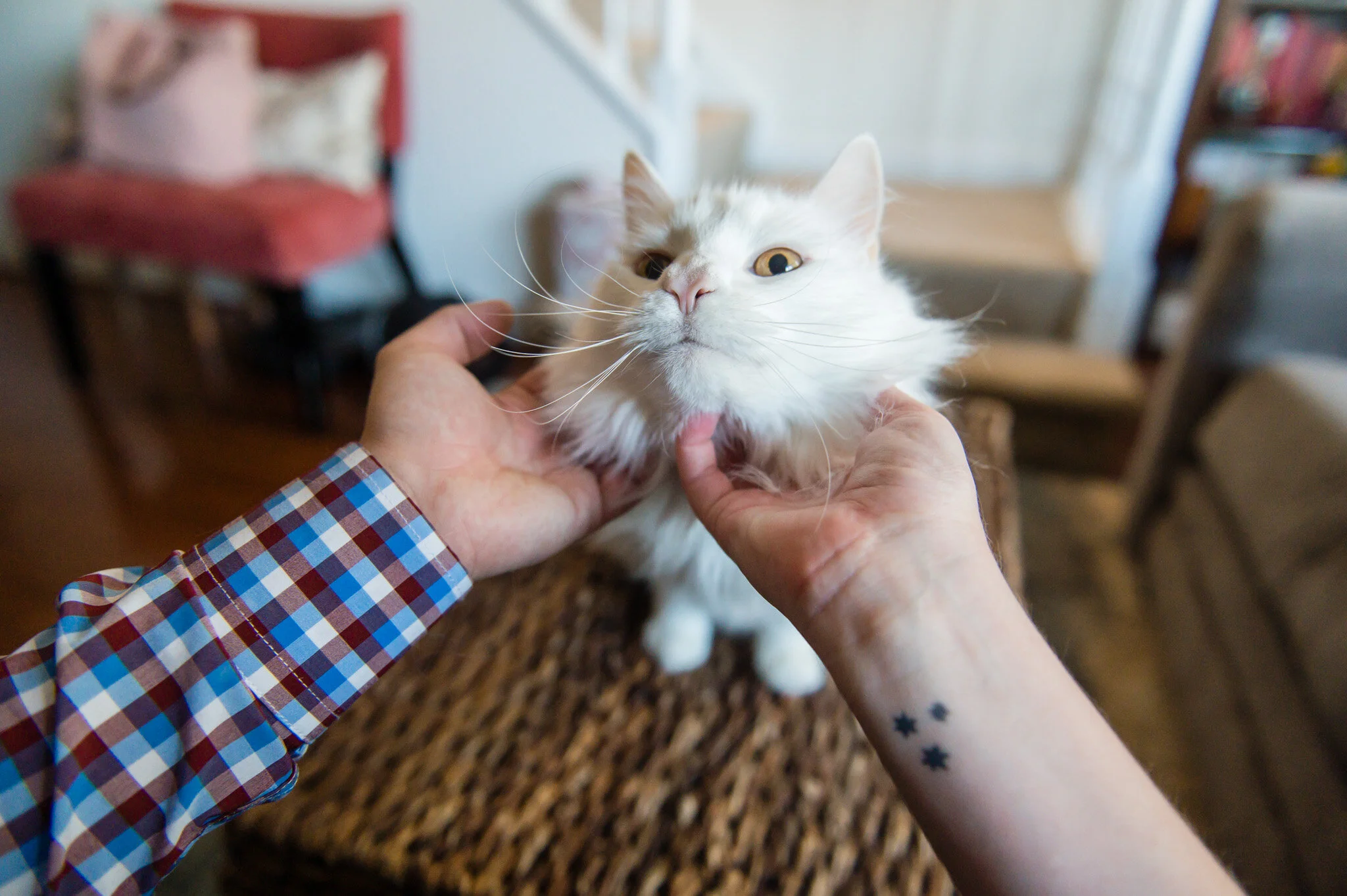 We started out at their house to include their adorable fluffy white cat Clinton and to get a few lifestyle shots in their home. From there we walked together to the Cathedral and simply explored around grounds, looking for interesting light, composition; anything that interested us. We found spots with gems of color and brilliant late-afternoon sunlight. We also made sure to get a few shots in front of the nearby coffee shop, Open City at the National Cathedral, a favorite of theirs in the area.