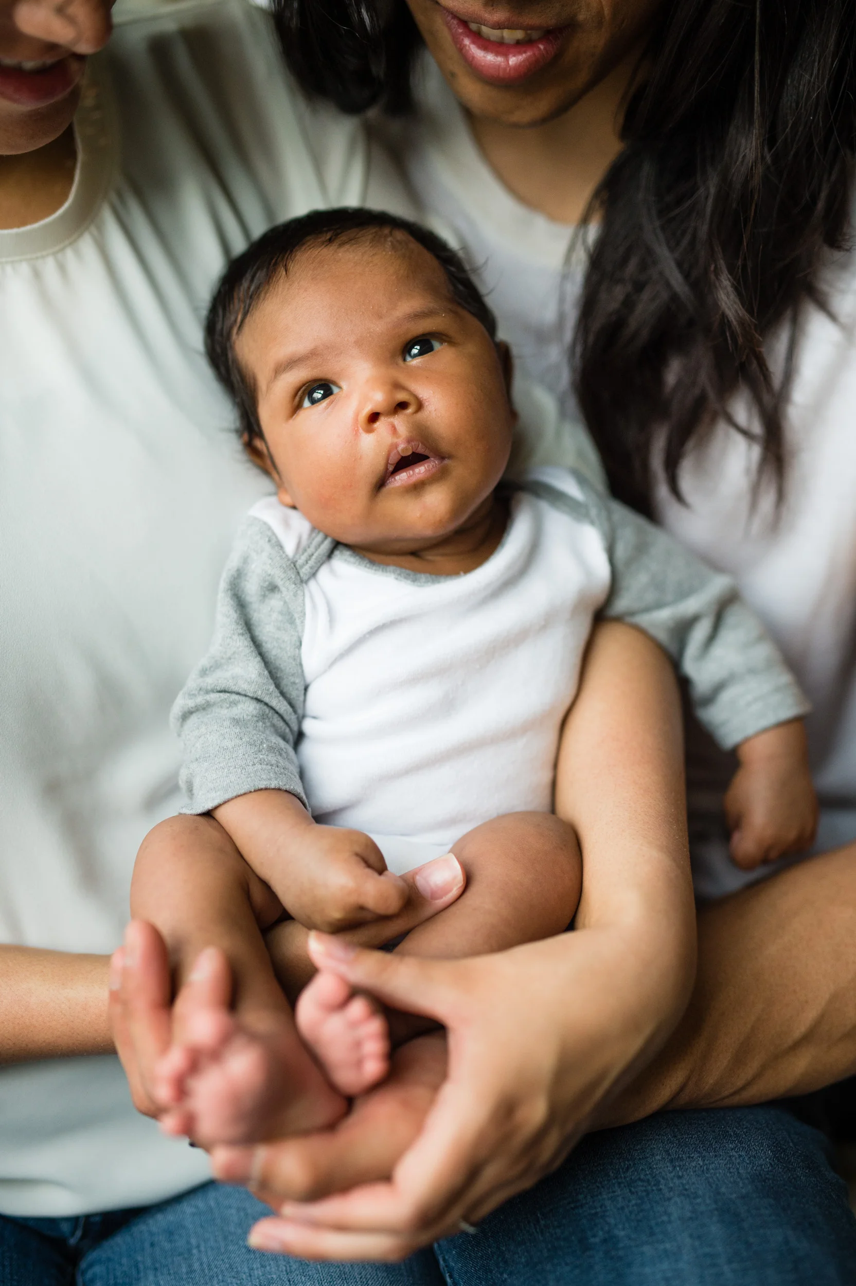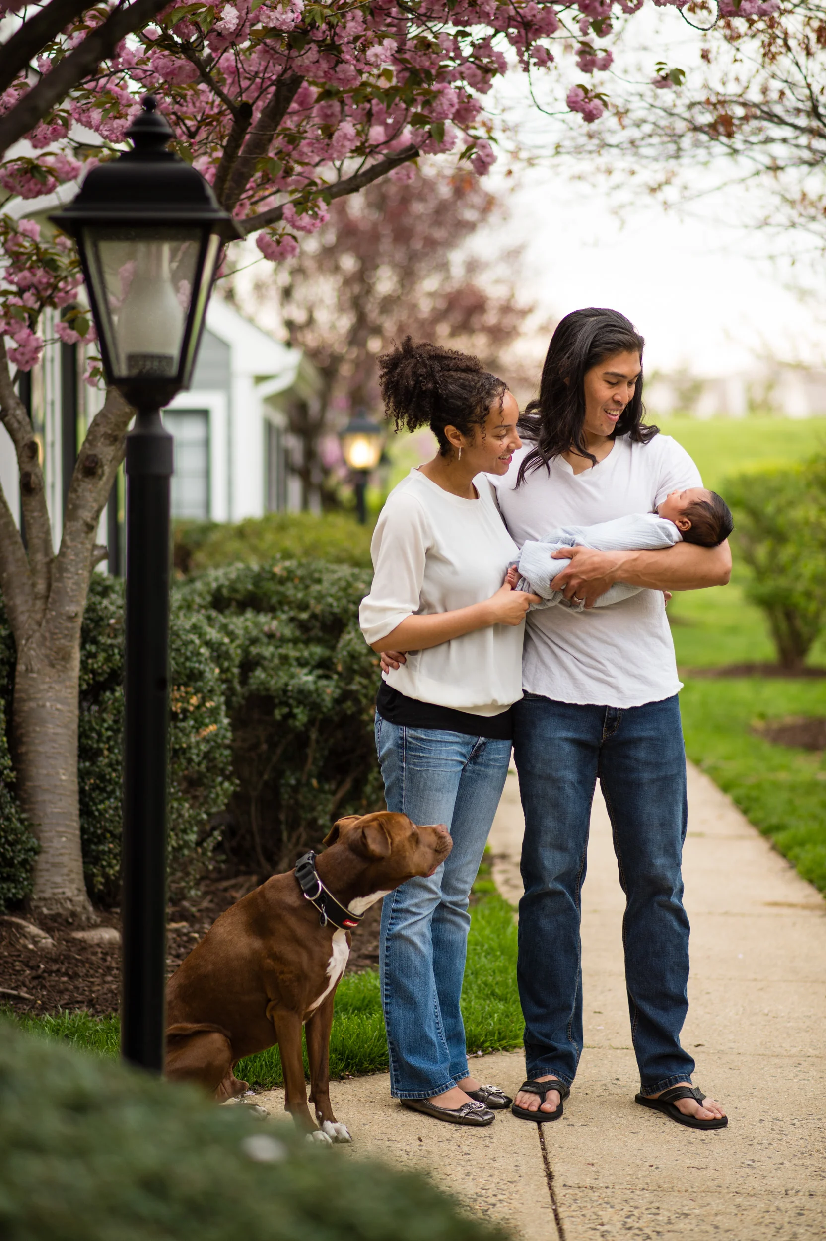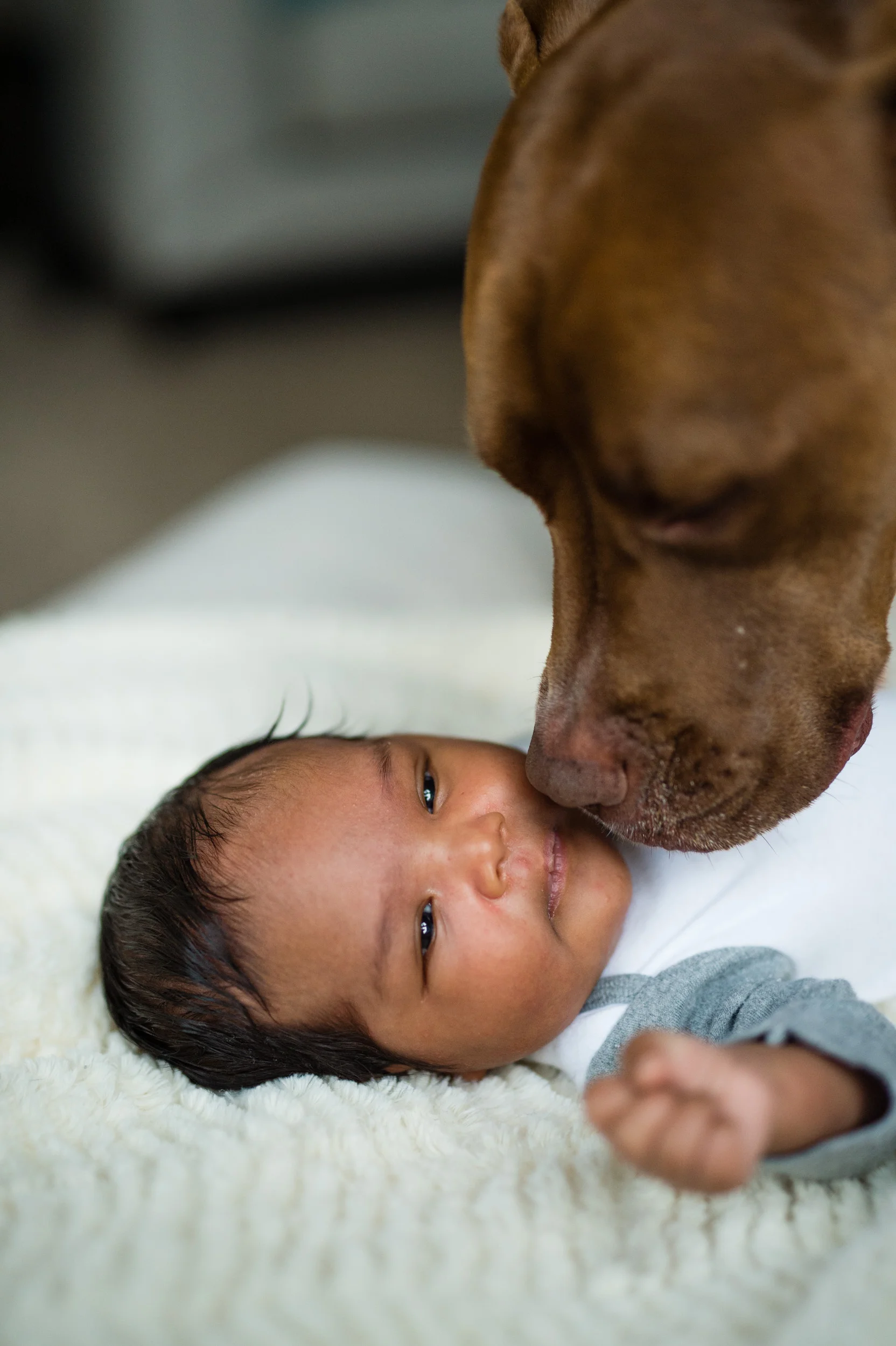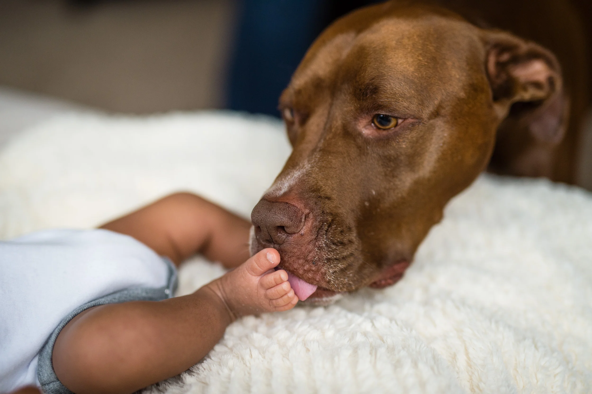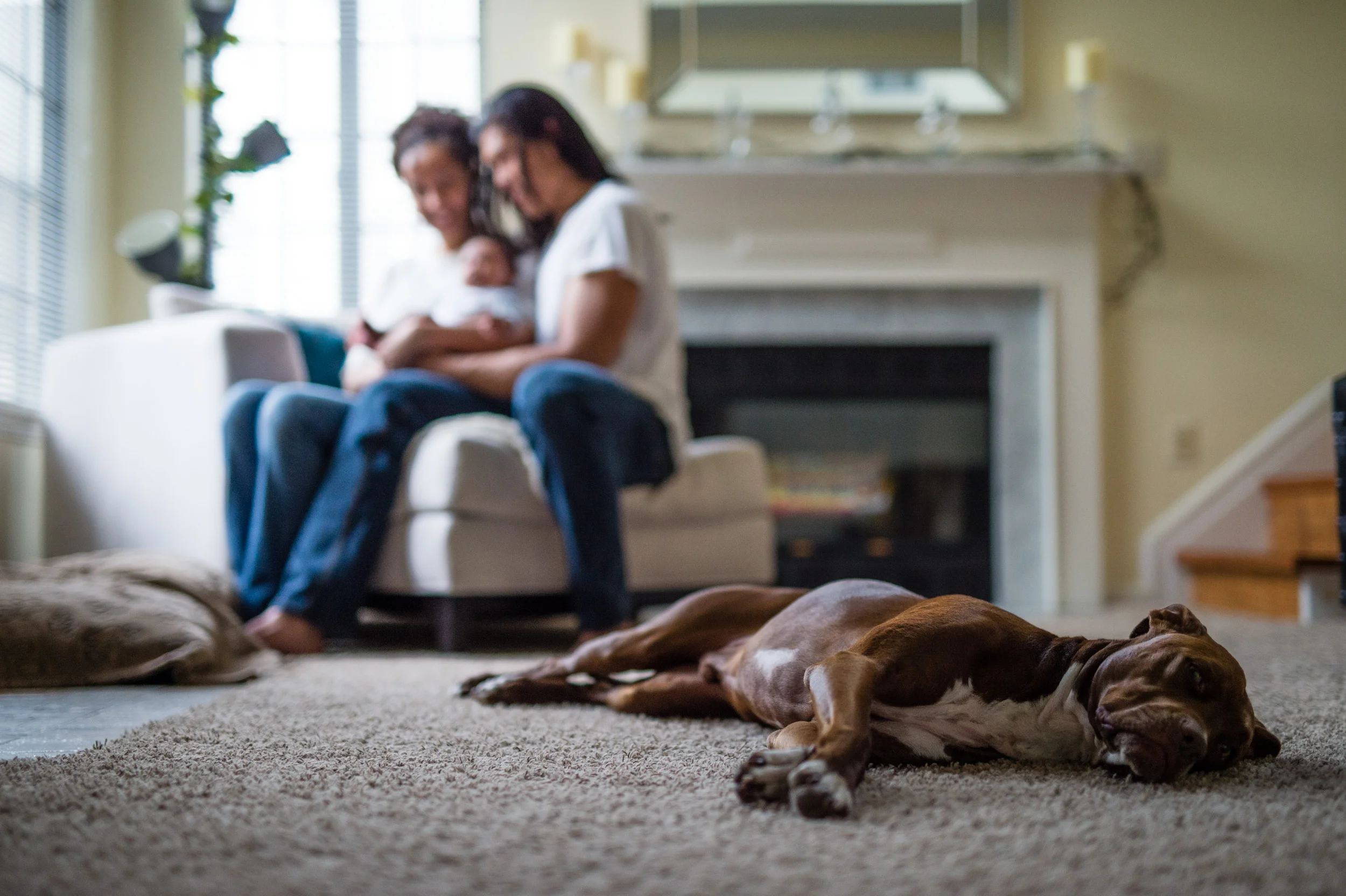 When Heather and Joe asked me to be the photographer to capture their one-month-old son Jake, I was excited! I personally love images that feature the family and the baby in the home and in spaces around the home. It’s a lifestyle approach, one that shows real life and the things that happen in a family, such as the dog licking the baby’s feet!