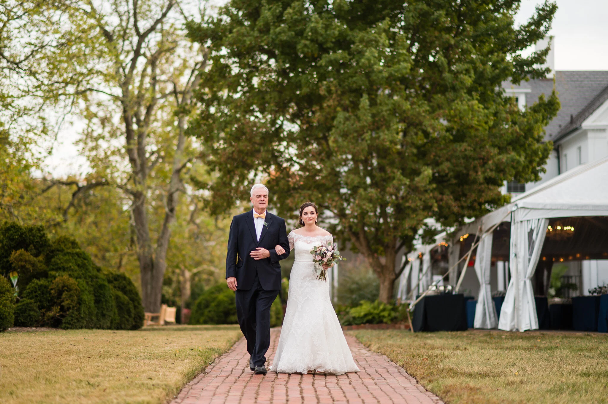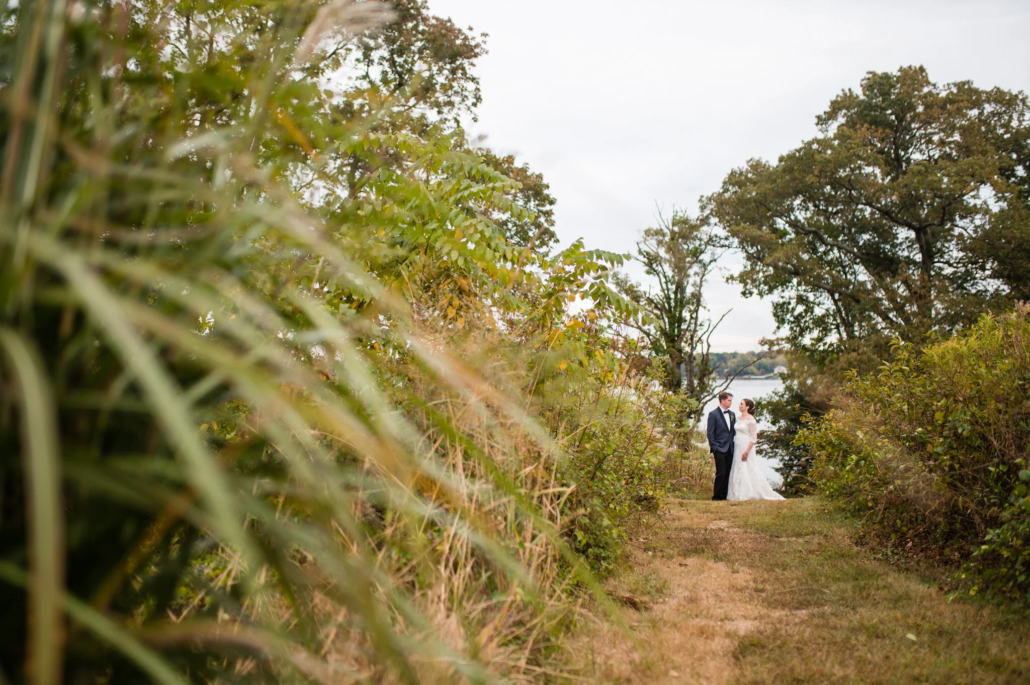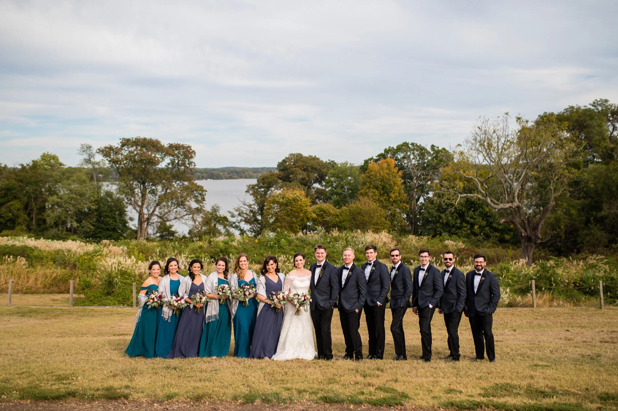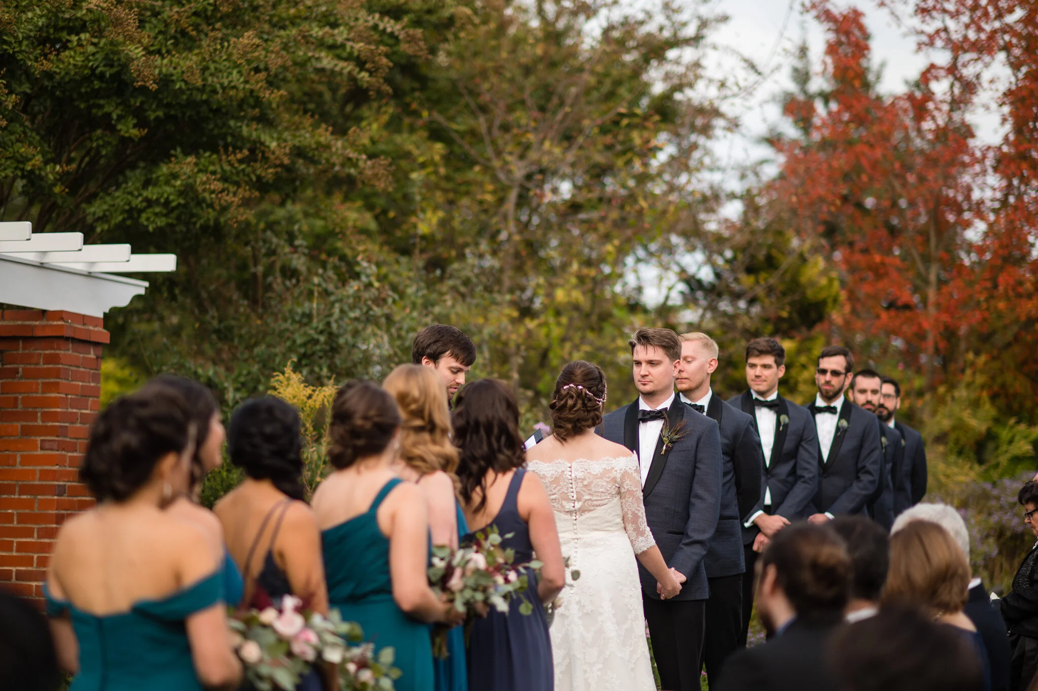 We moved to River Farm midday and caught beautiful moments as Caroline finished getting into her dress and everyone around her saw her fully ready for the first time. River Farm is the home of the American Horticultural Society and a wonderful place in autumn. Joey and Caroline wanted to have their wedding there not just because they are nature lovers, but because they wanted to support the work of the Horticultural Society. Fall was just truly getting started, with only a few trees having turned orange, red, and brown. But those few trees were plenty for us to get incredible fall images!