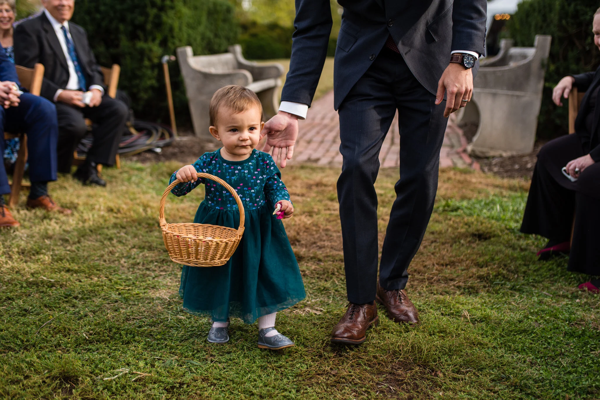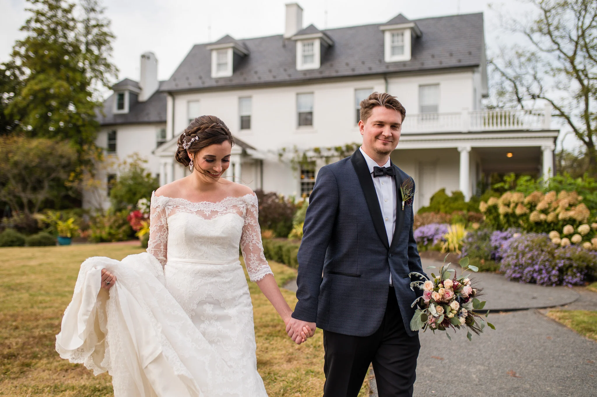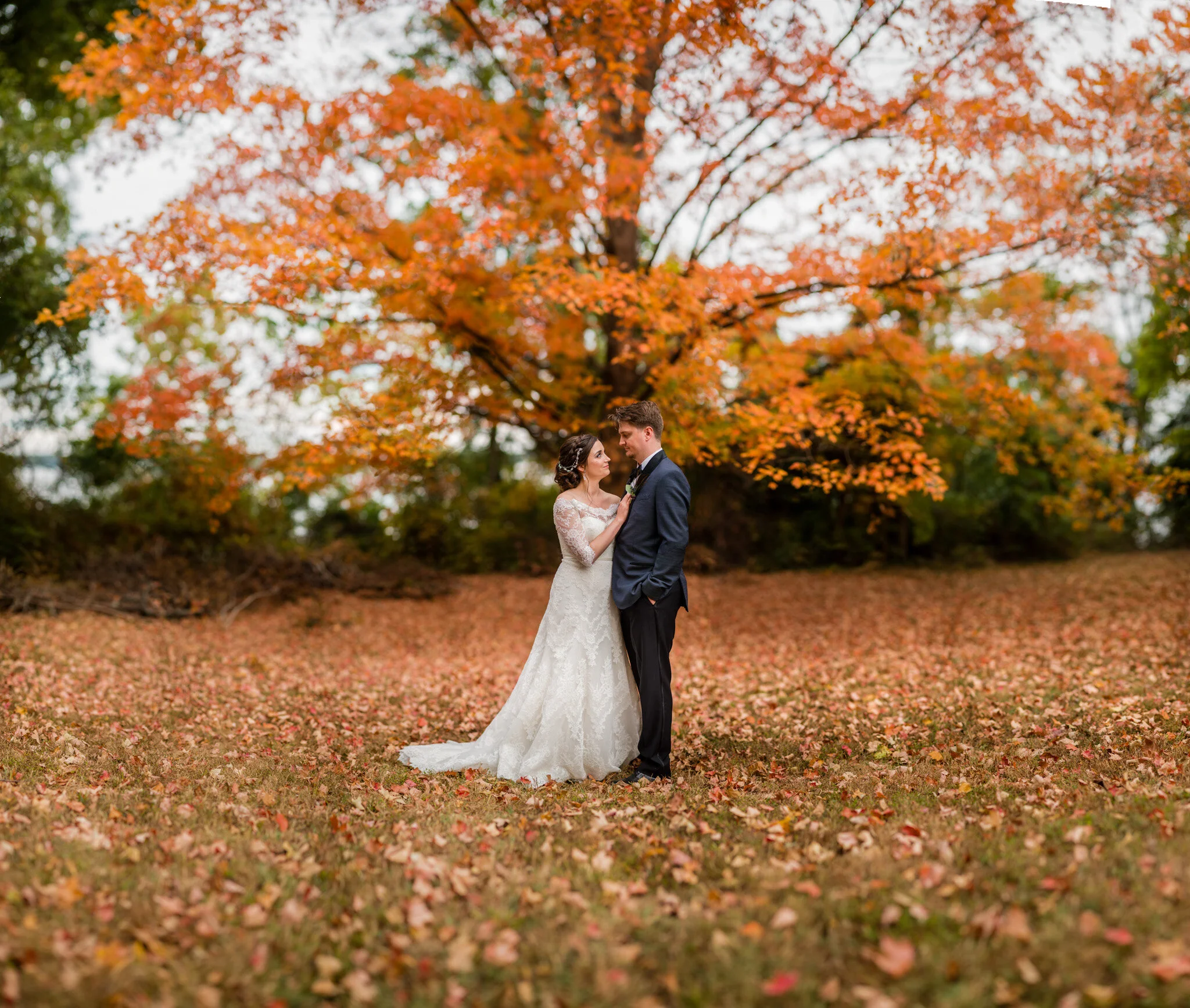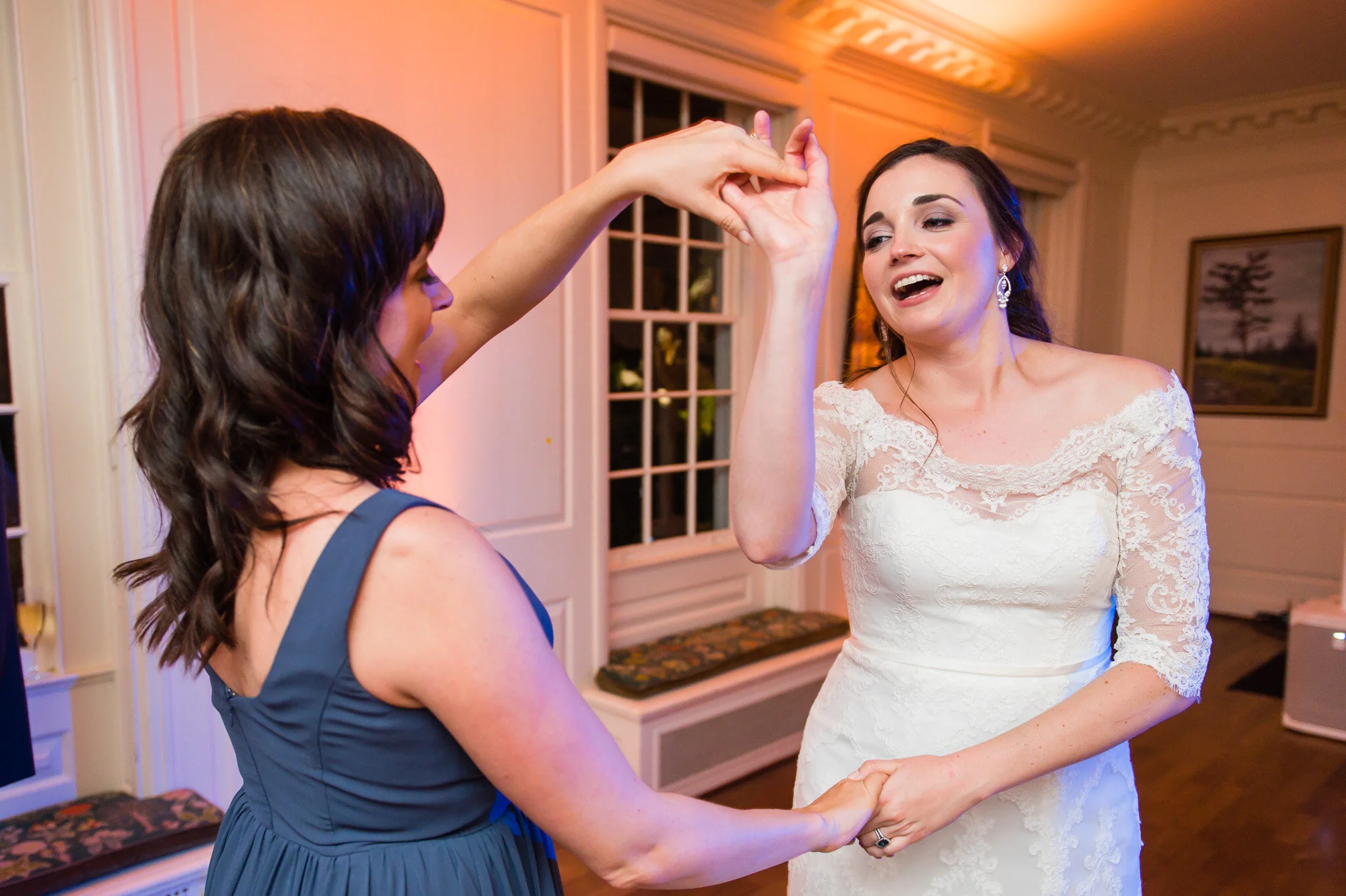 We moved to River Farm midday and caught beautiful moments as Caroline finished getting into her dress and everyone around her saw her fully ready for the first time. River Farm is the home of the American Horticultural Society and a wonderful place in autumn. Joey and Caroline wanted to have their wedding there not just because they are nature lovers, but because they wanted to support the work of the Horticultural Society. Fall was just truly getting started, with only a few trees having turned orange, red, and brown. But those few trees were plenty for us to get incredible fall images!