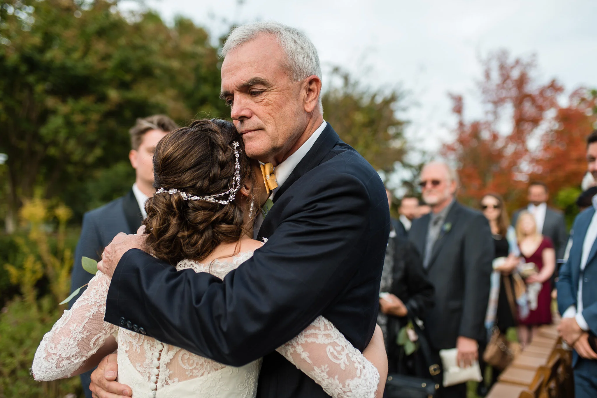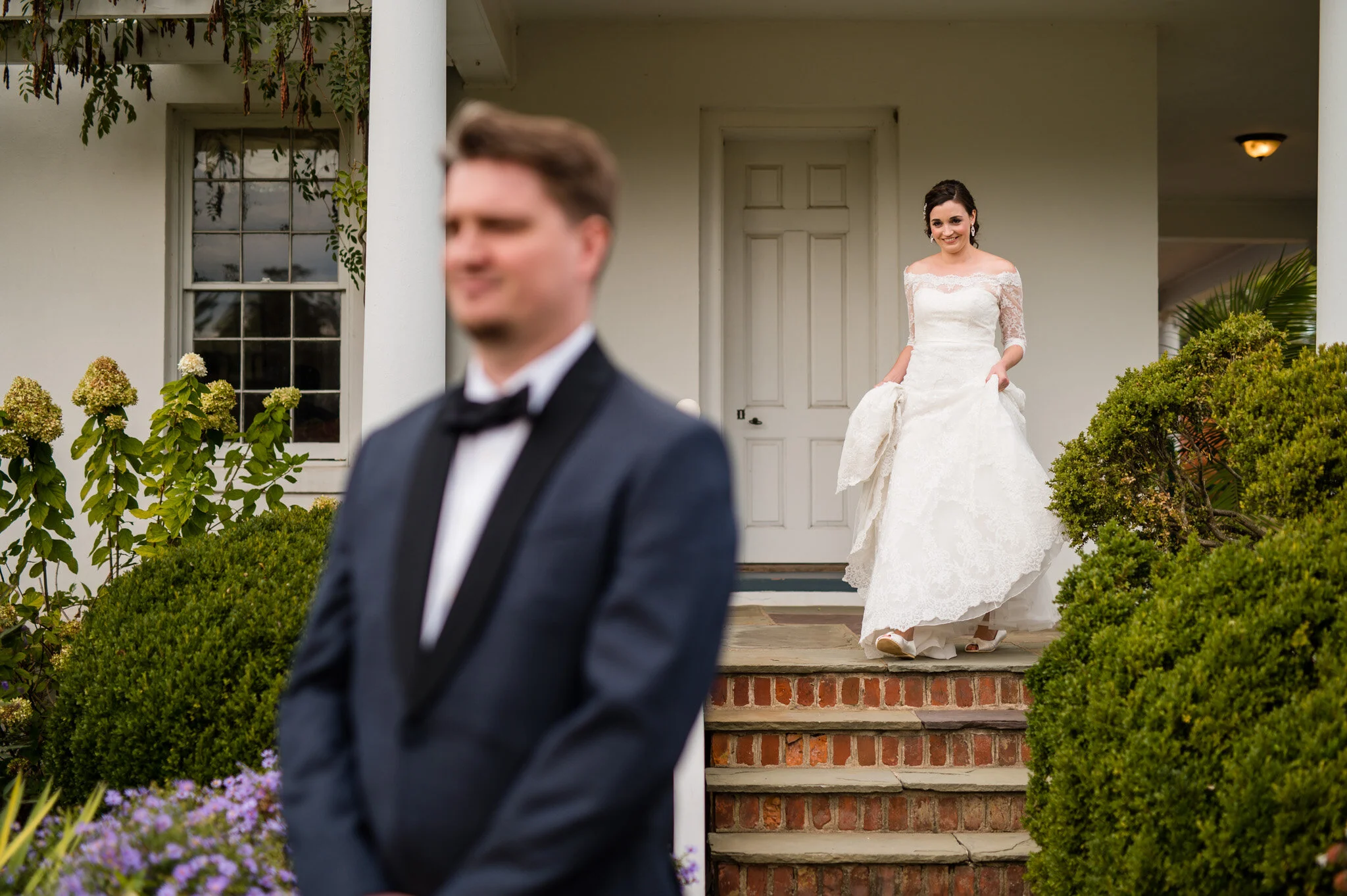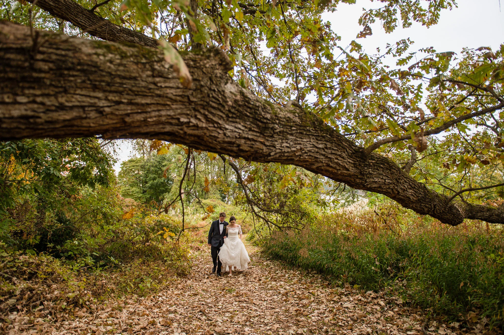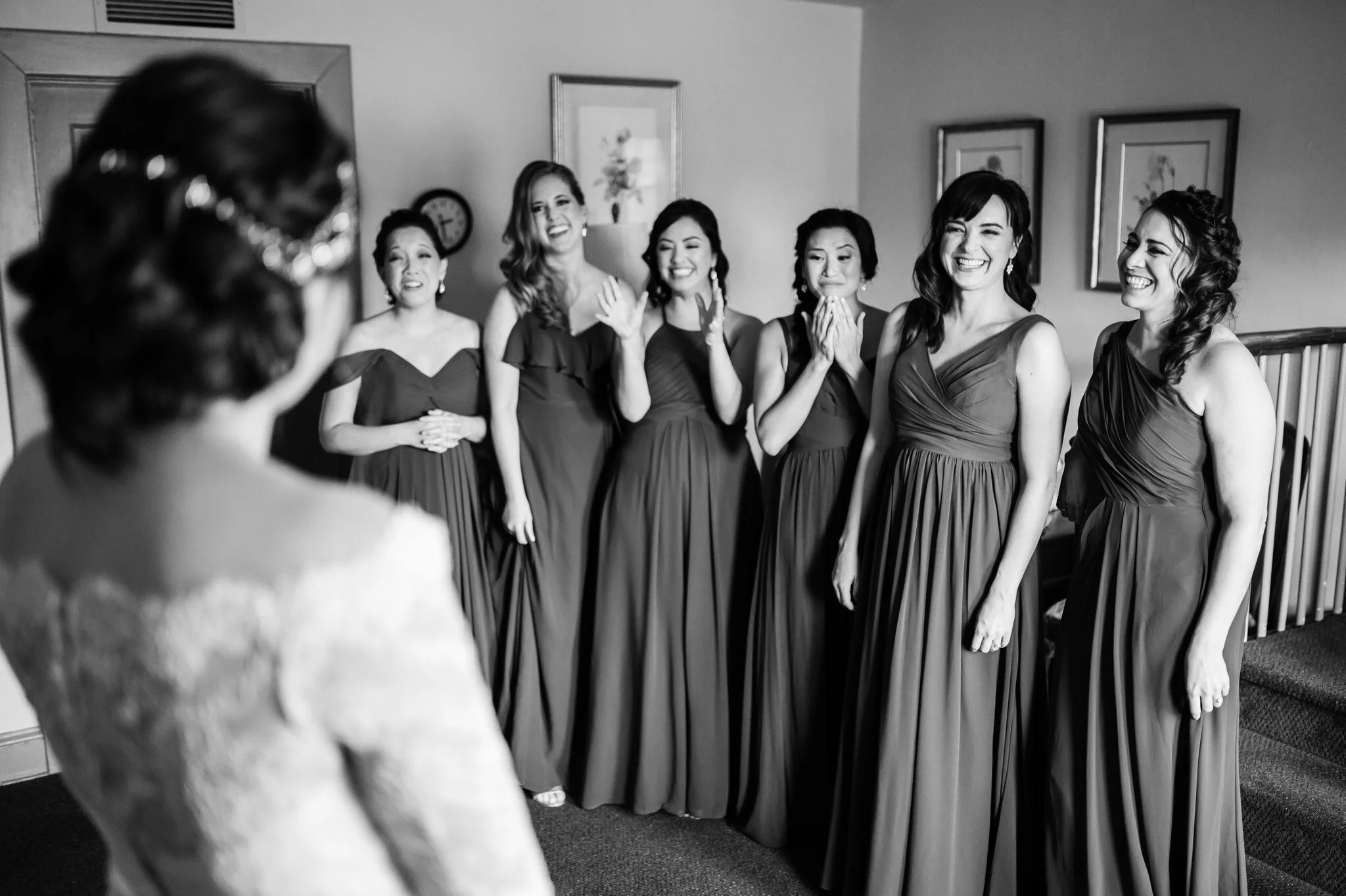 We moved to River Farm midday and caught beautiful moments as Caroline finished getting into her dress and everyone around her saw her fully ready for the first time. River Farm is the home of the American Horticultural Society and a wonderful place in autumn. Joey and Caroline wanted to have their wedding there not just because they are nature lovers, but because they wanted to support the work of the Horticultural Society. Fall was just truly getting started, with only a few trees having turned orange, red, and brown. But those few trees were plenty for us to get incredible fall images!