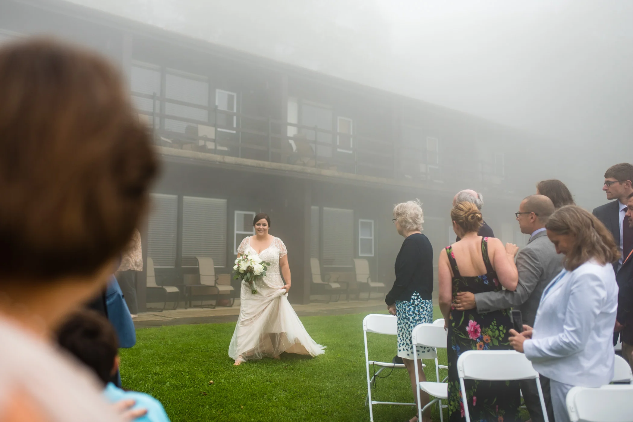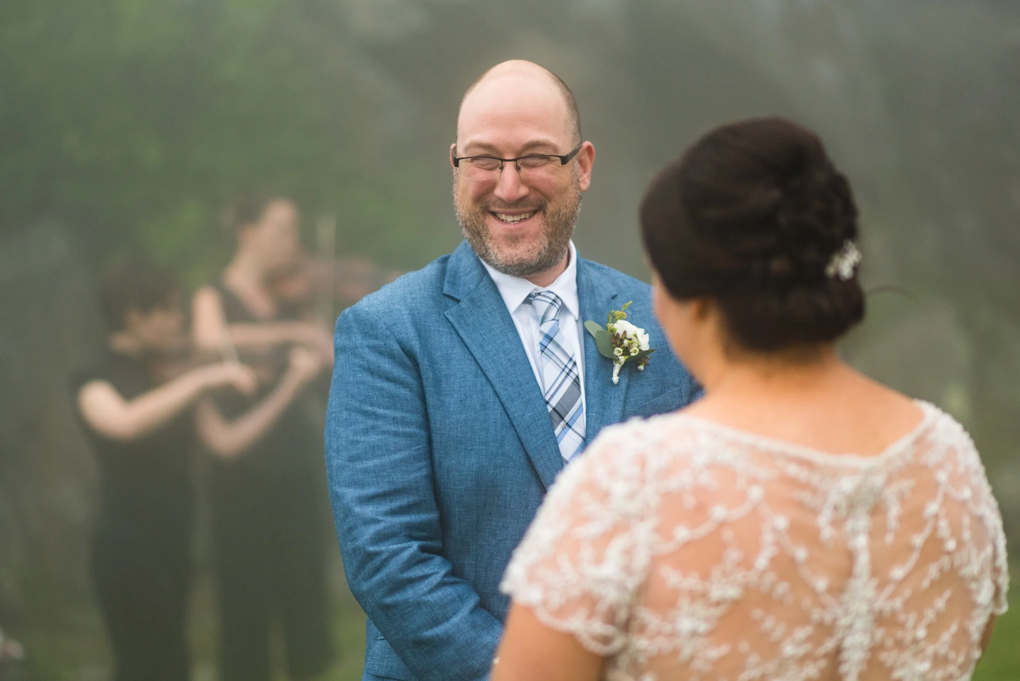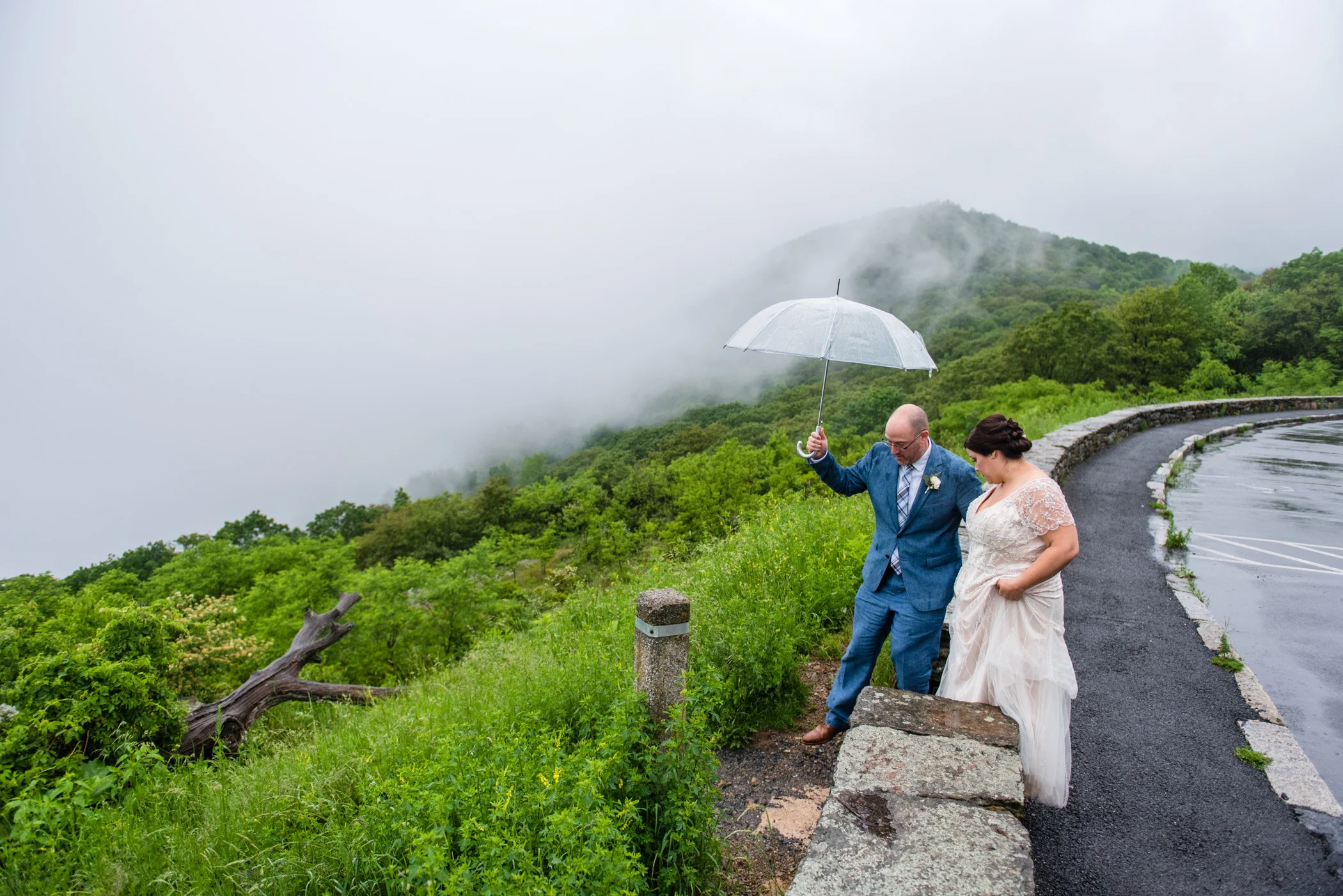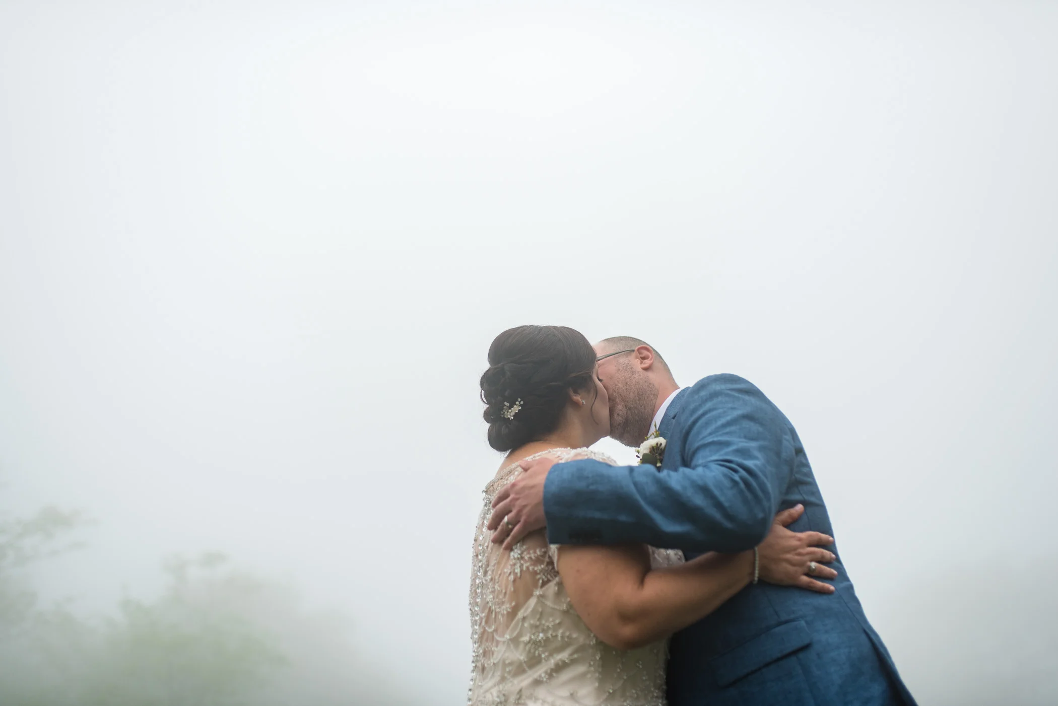Fortunately we didn’t experience any rain until later after the ceremony, but they literally said “I do” in a cloud! Later we went for portraits at an overlook, hoping in vain that a break in the clouds might appear. They continuously rolled over the ridge, blocking the views of the valley, yet we were still were able to enjoy portraits with the lush green, winding trees, and even a few shots in the rain.