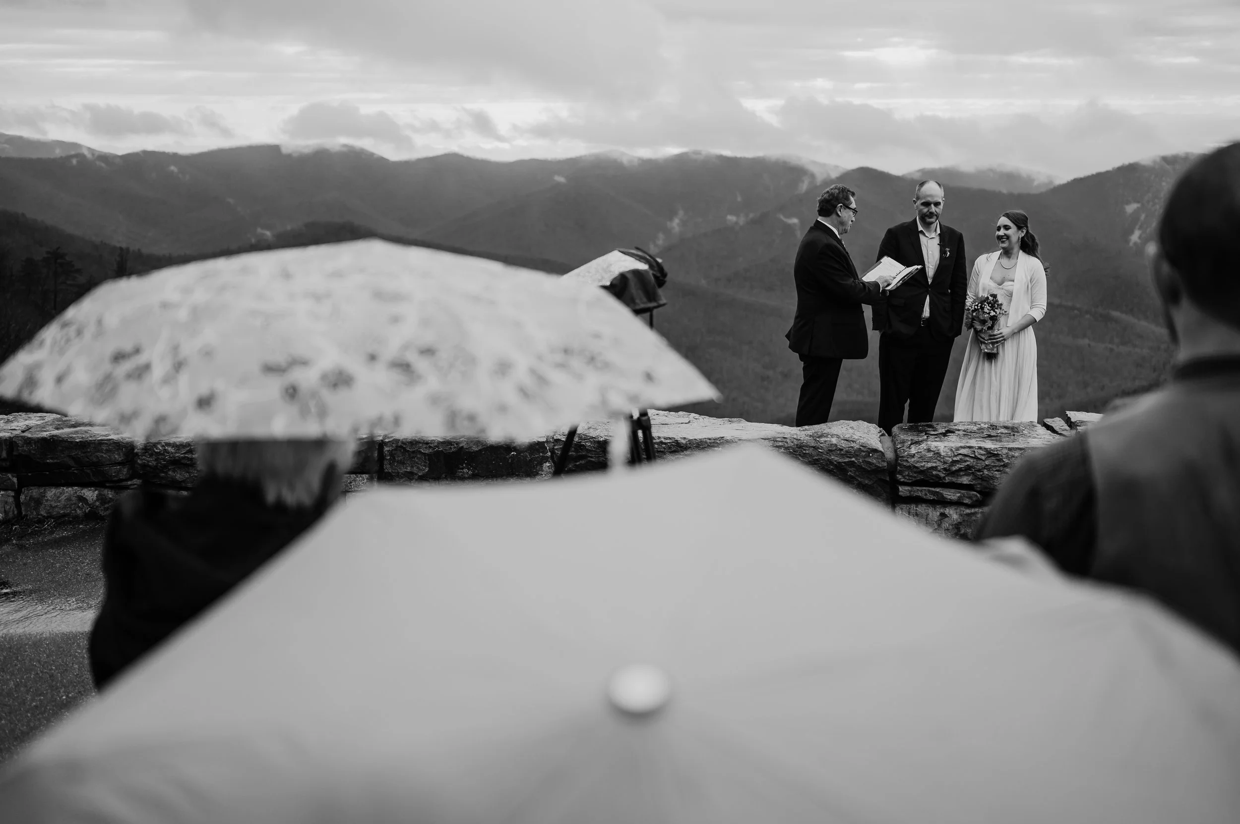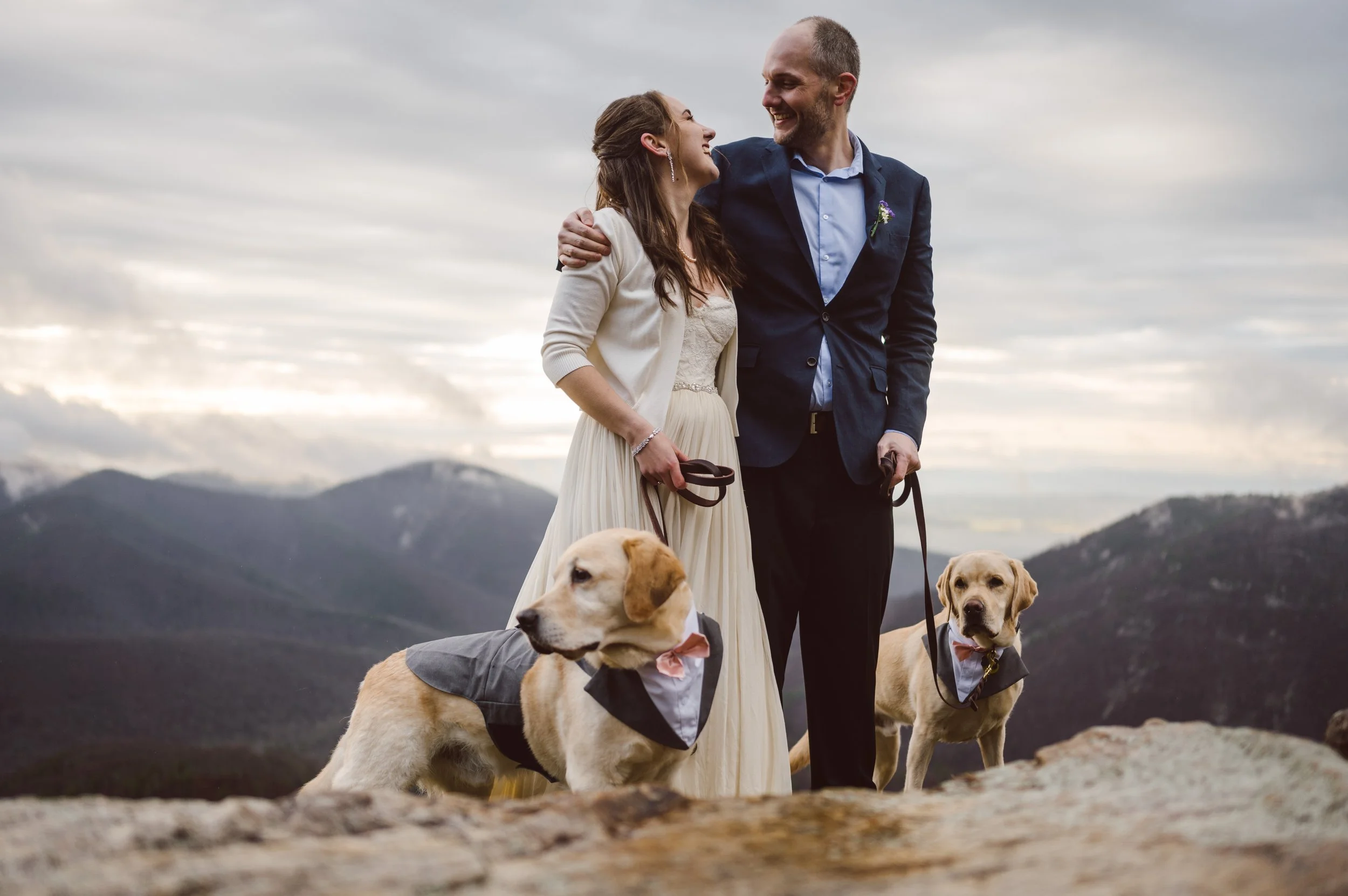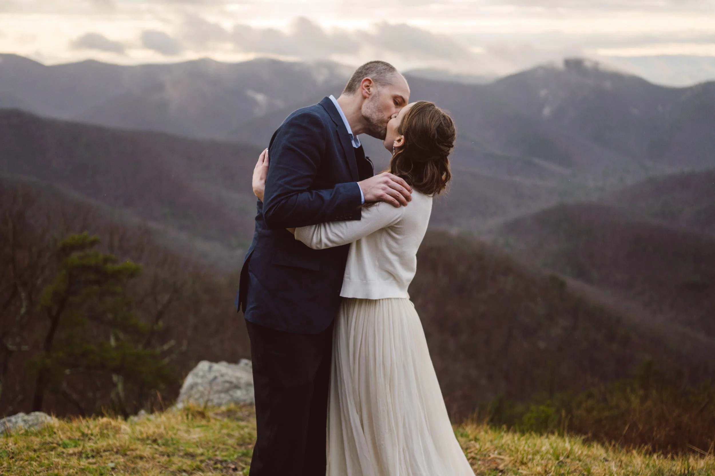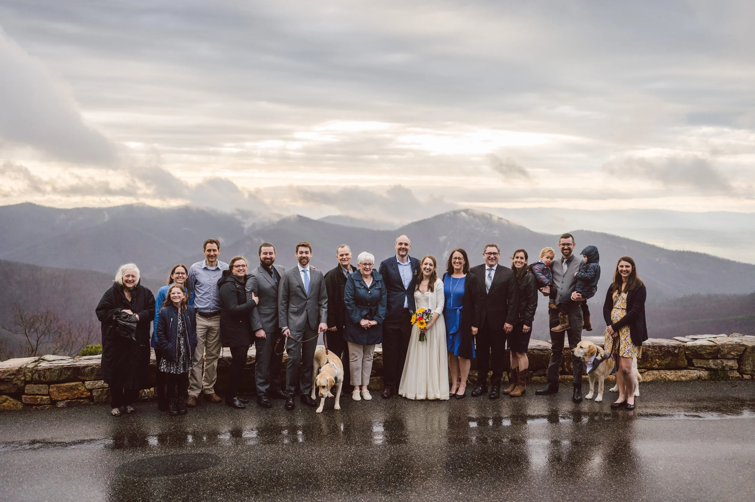 Although the day was mostly overcast and rainy, we were hoping to get beautiful light at the ceremony, and we sure did! The ceremony took place at an overlook on Skyline Drive, with mountain ranges wrapping around them, their family, and their beloved dogs.