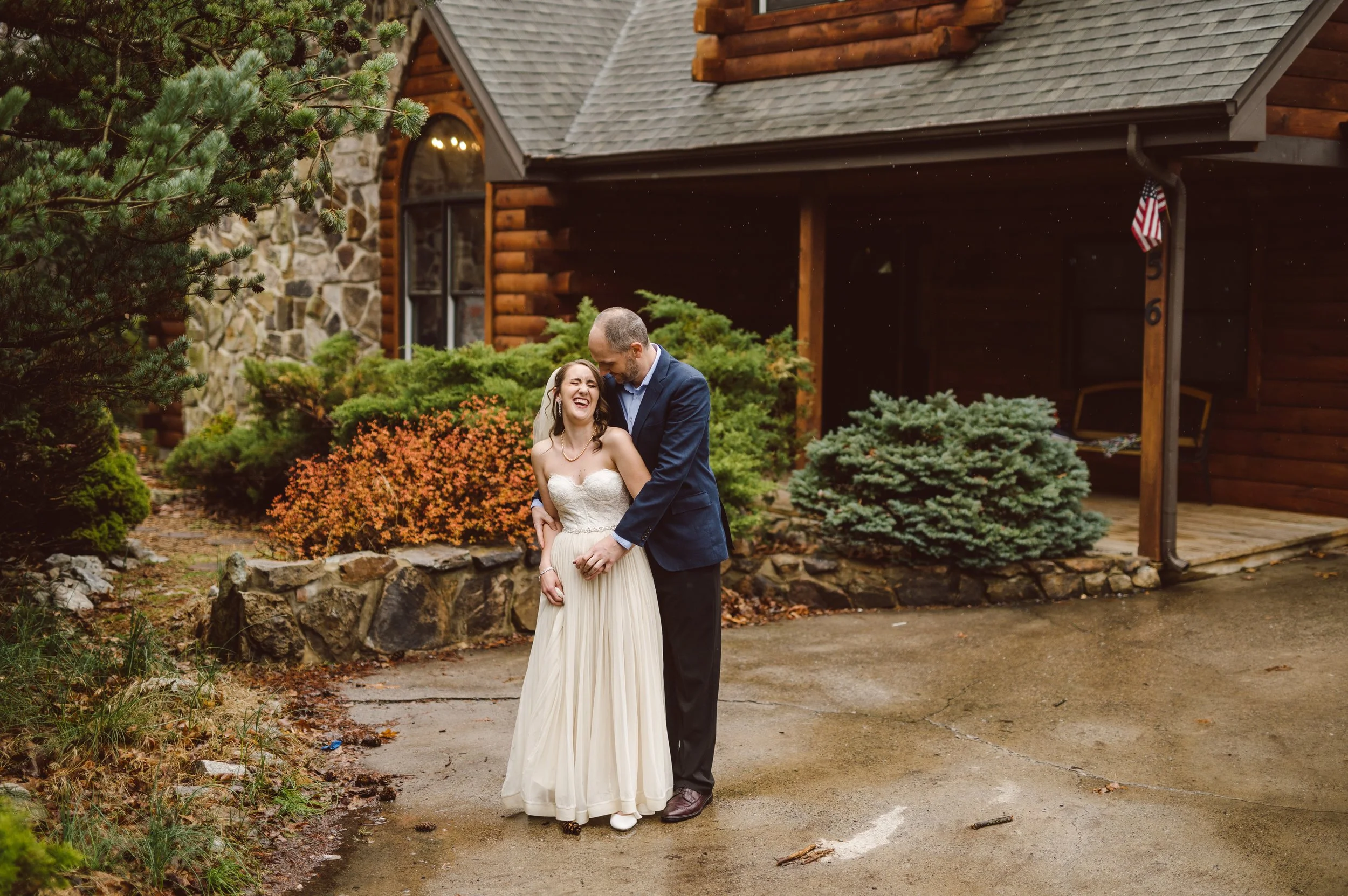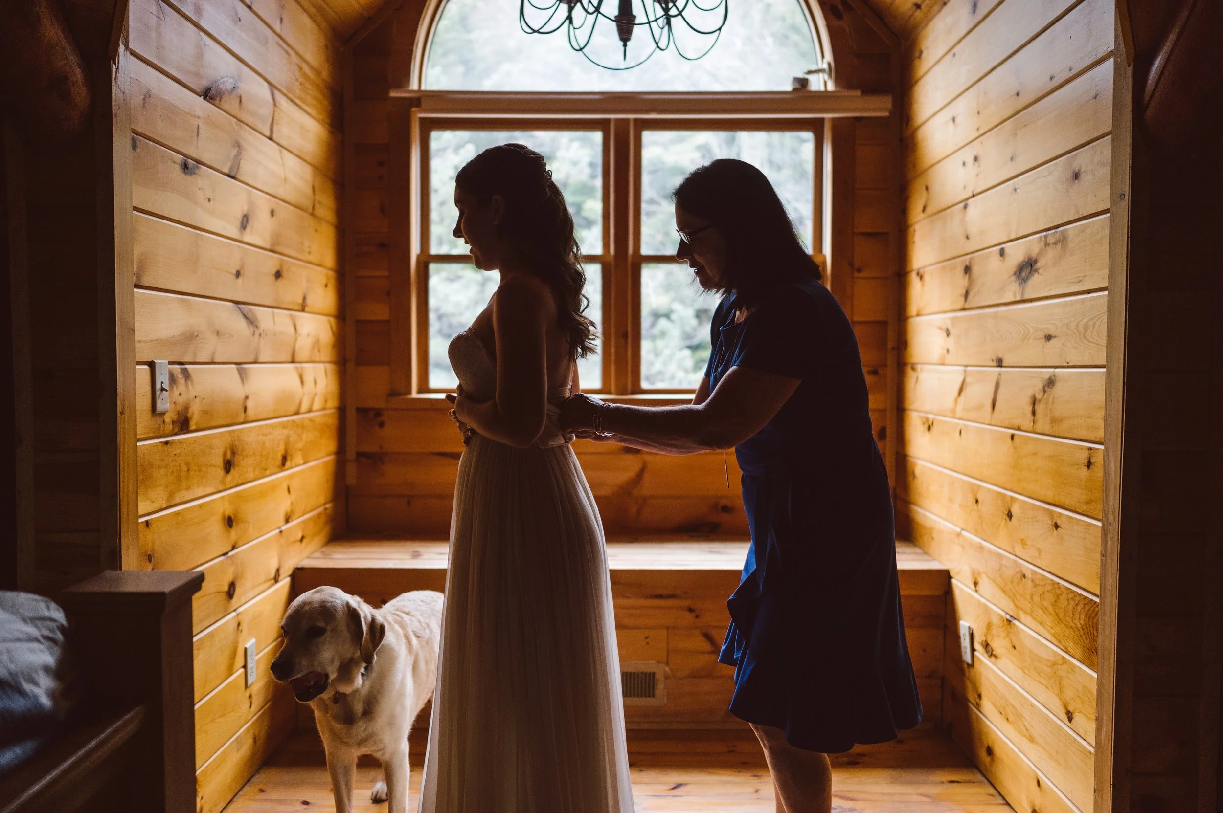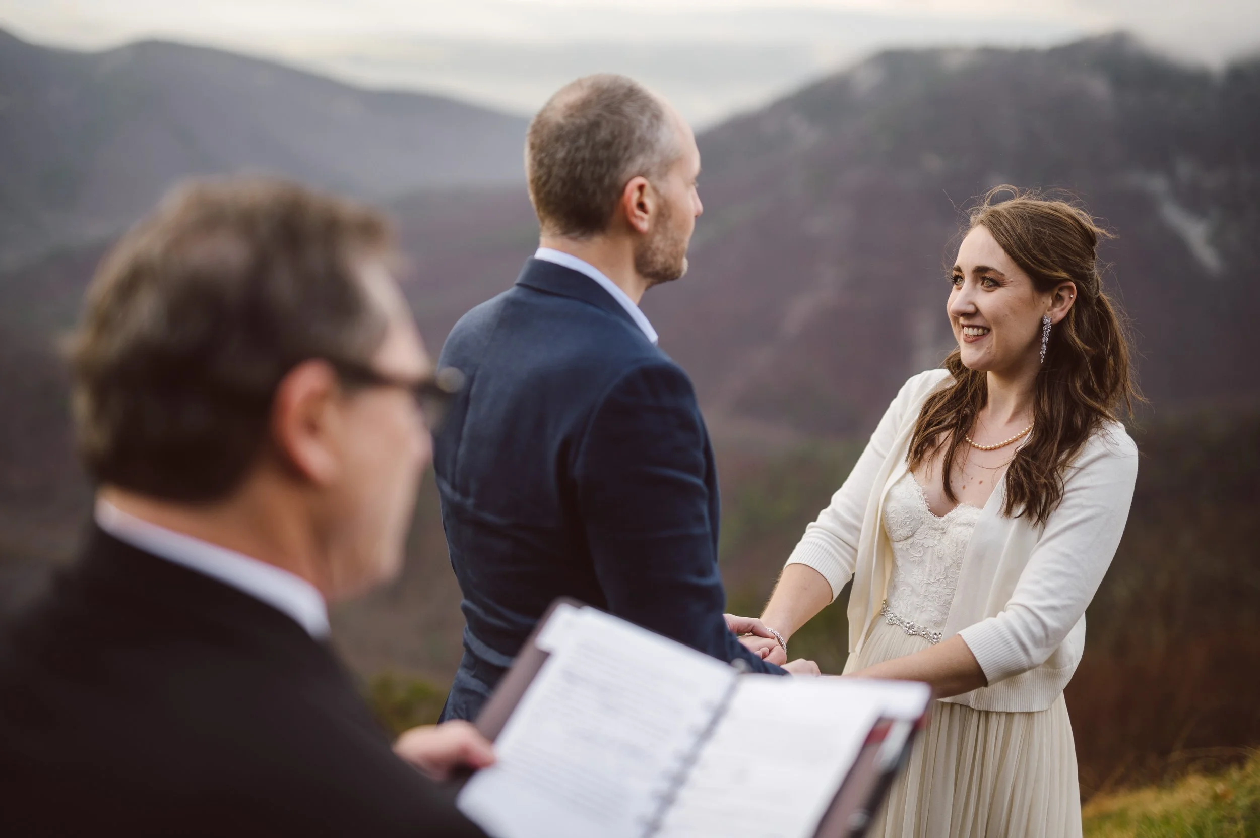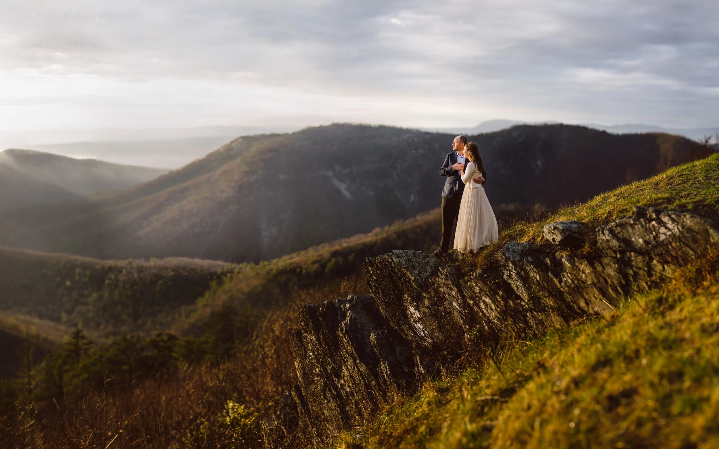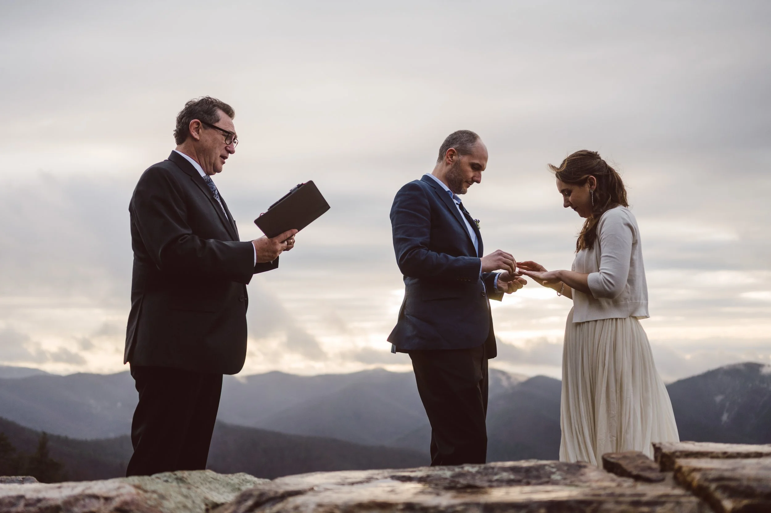Although the day was mostly overcast and rainy, we were hoping to get beautiful light at the ceremony, and we sure did! The ceremony took place at an overlook on Skyline Drive, with mountain ranges wrapping around them, their family, and their beloved dogs.