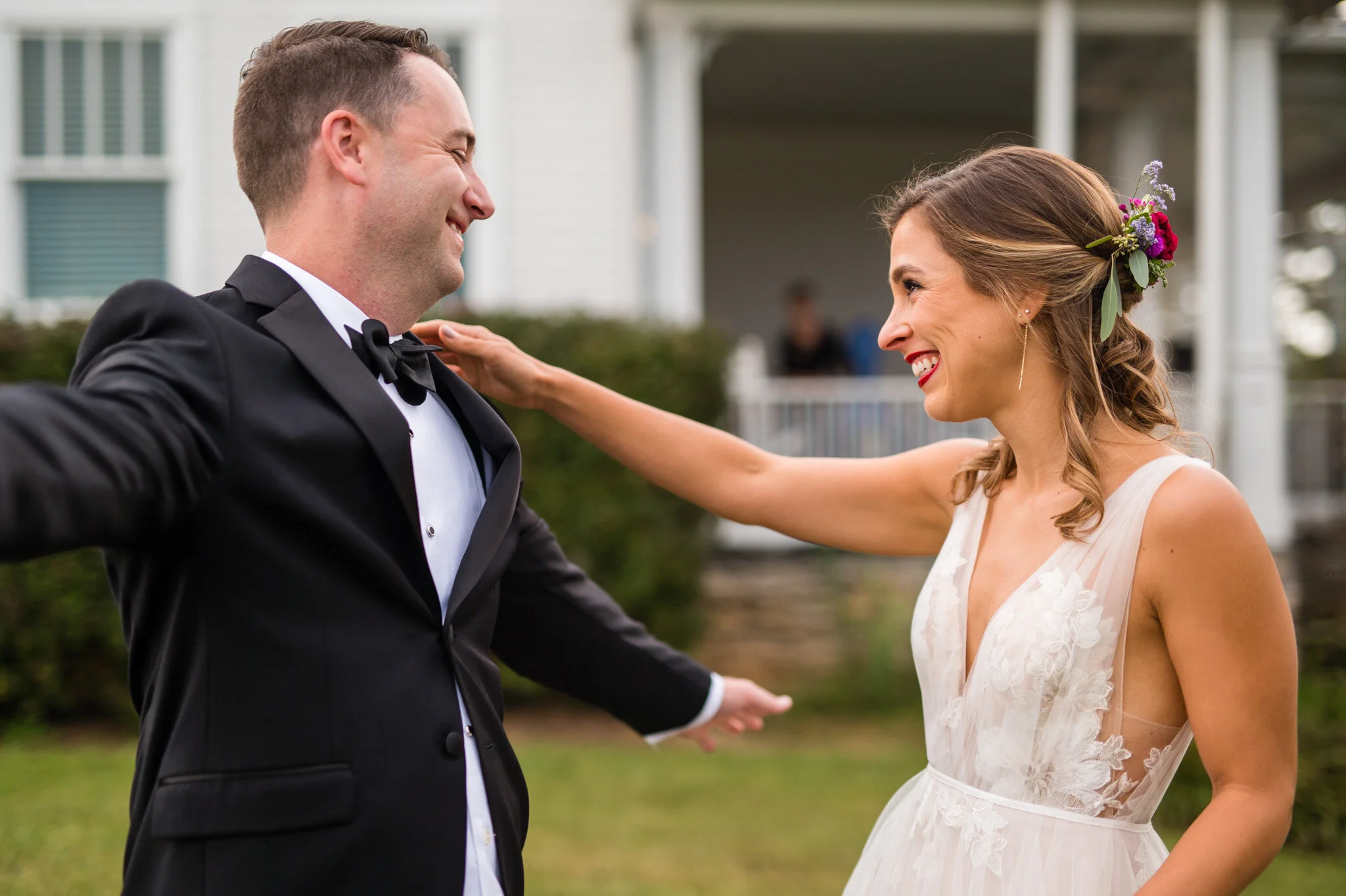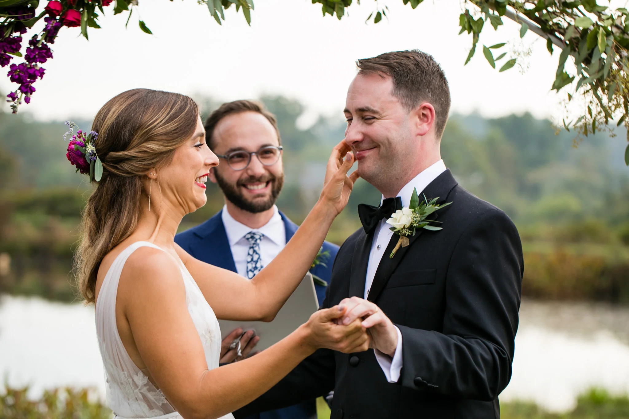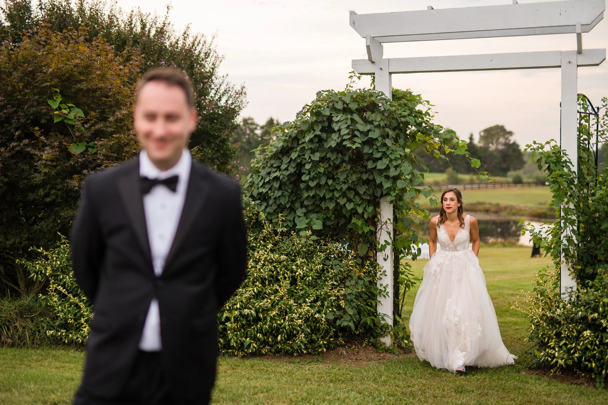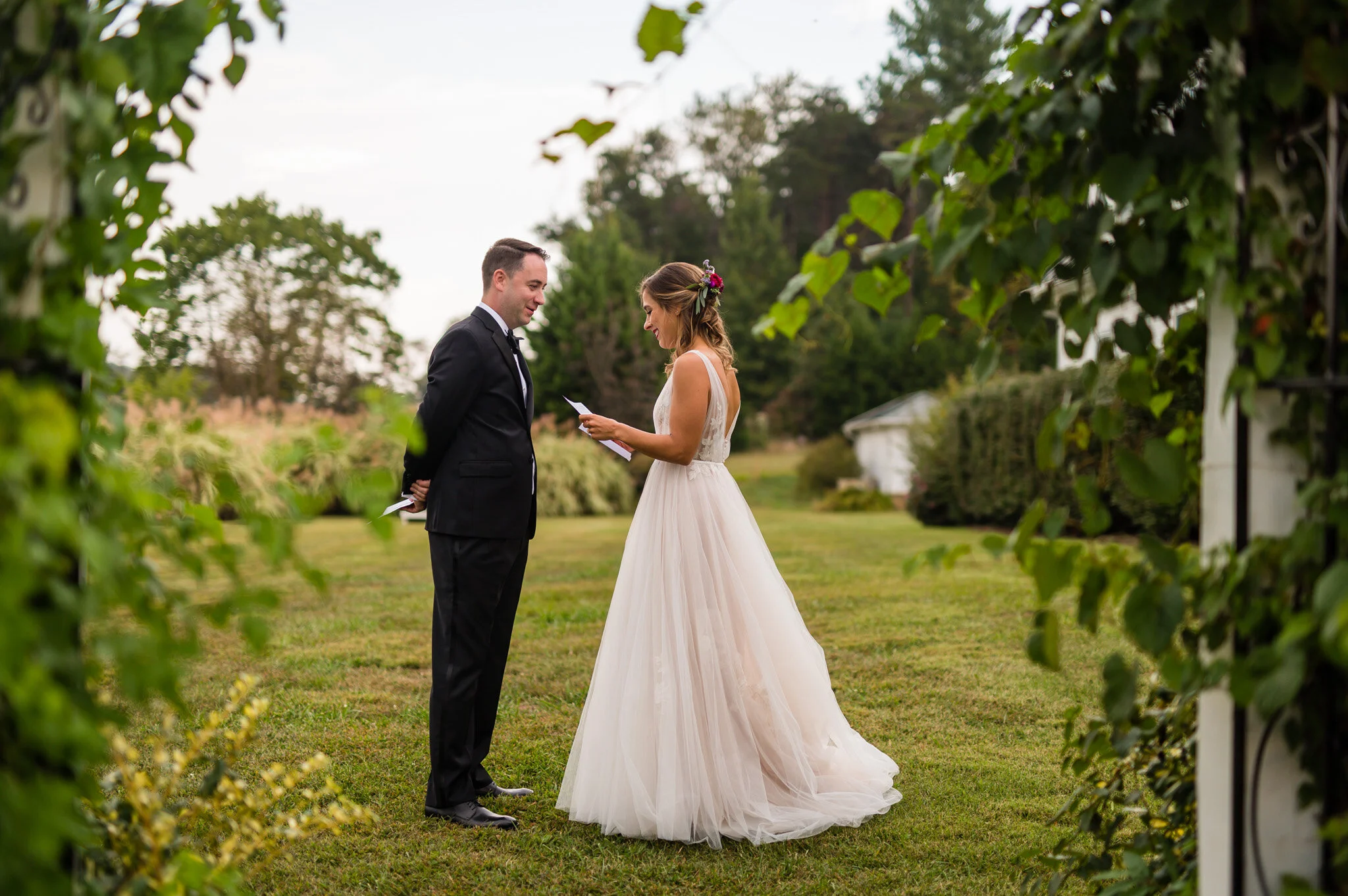 The day wasn’t without it’s challenges, as we did encounter some rain that forced the vendor team to be quick and nimble setting everything up. But all in all we were still able to enjoy a beautiful outdoor ceremony and soft warm light for our photos that evening. My favorite moment of the day had to be their first look and personal vows to each other. Be sure to scroll down to see their reactions to each other!