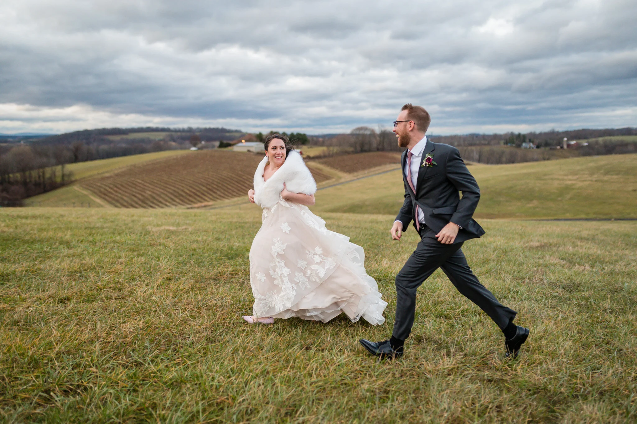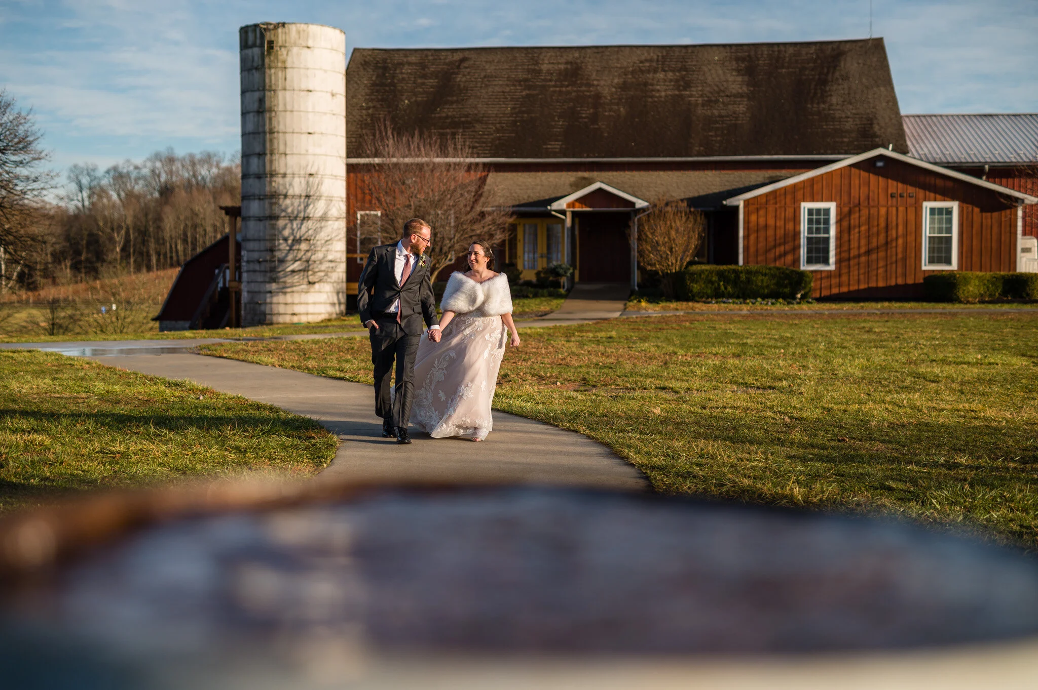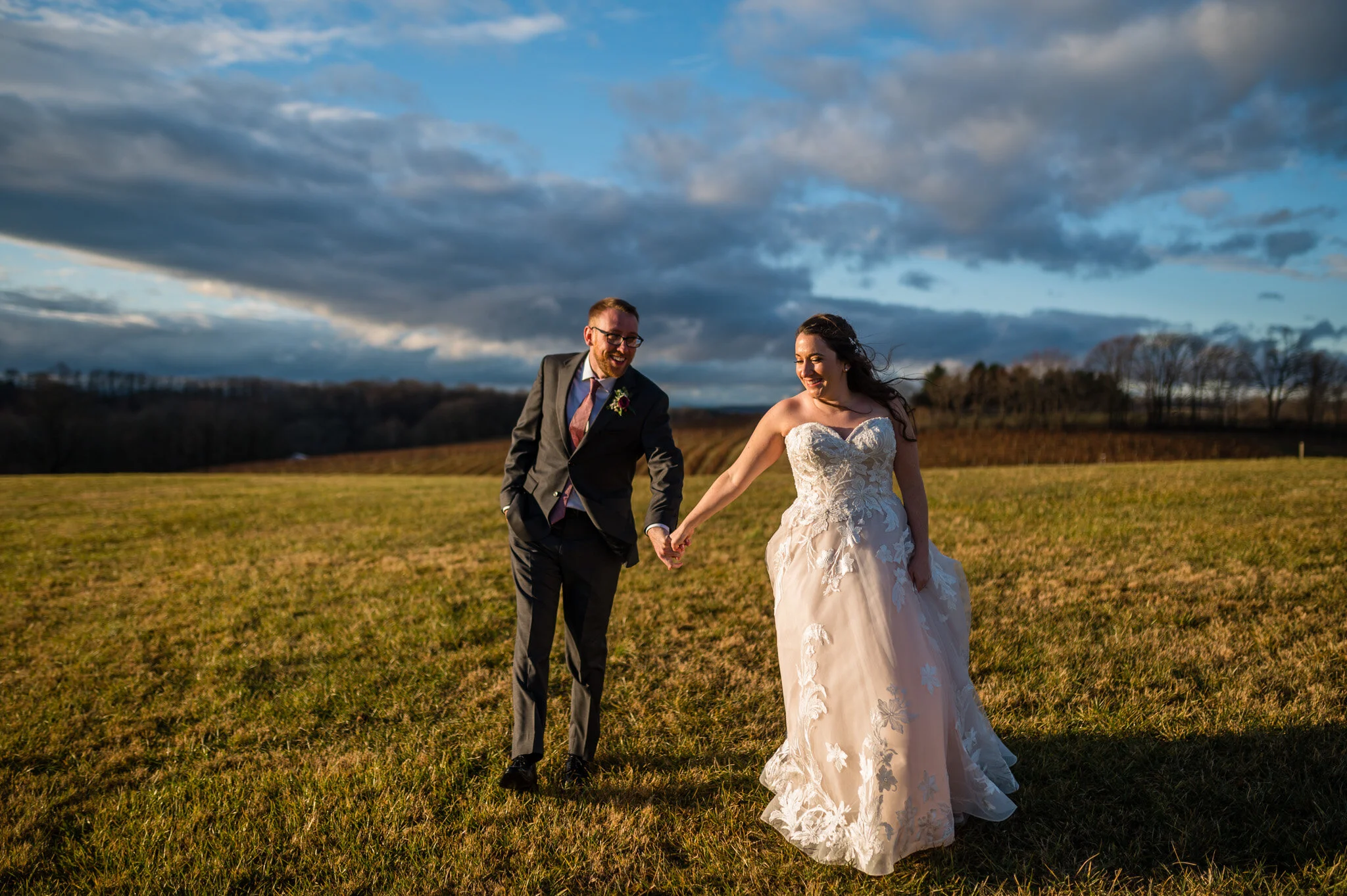 From there we took the beautiful drive to their reception at Linganore Winery! Though it was cold and windy the rain had moved off and bright sunlight mixed with moody clouds, giving us an epic backdrop to capture. Linganore is a rustic barn venue situated right in an area that gave us a full 360 view of the sunset and surrounding area. Charlie and Holly braved the high winds and came back with some of my favorite images of the year!