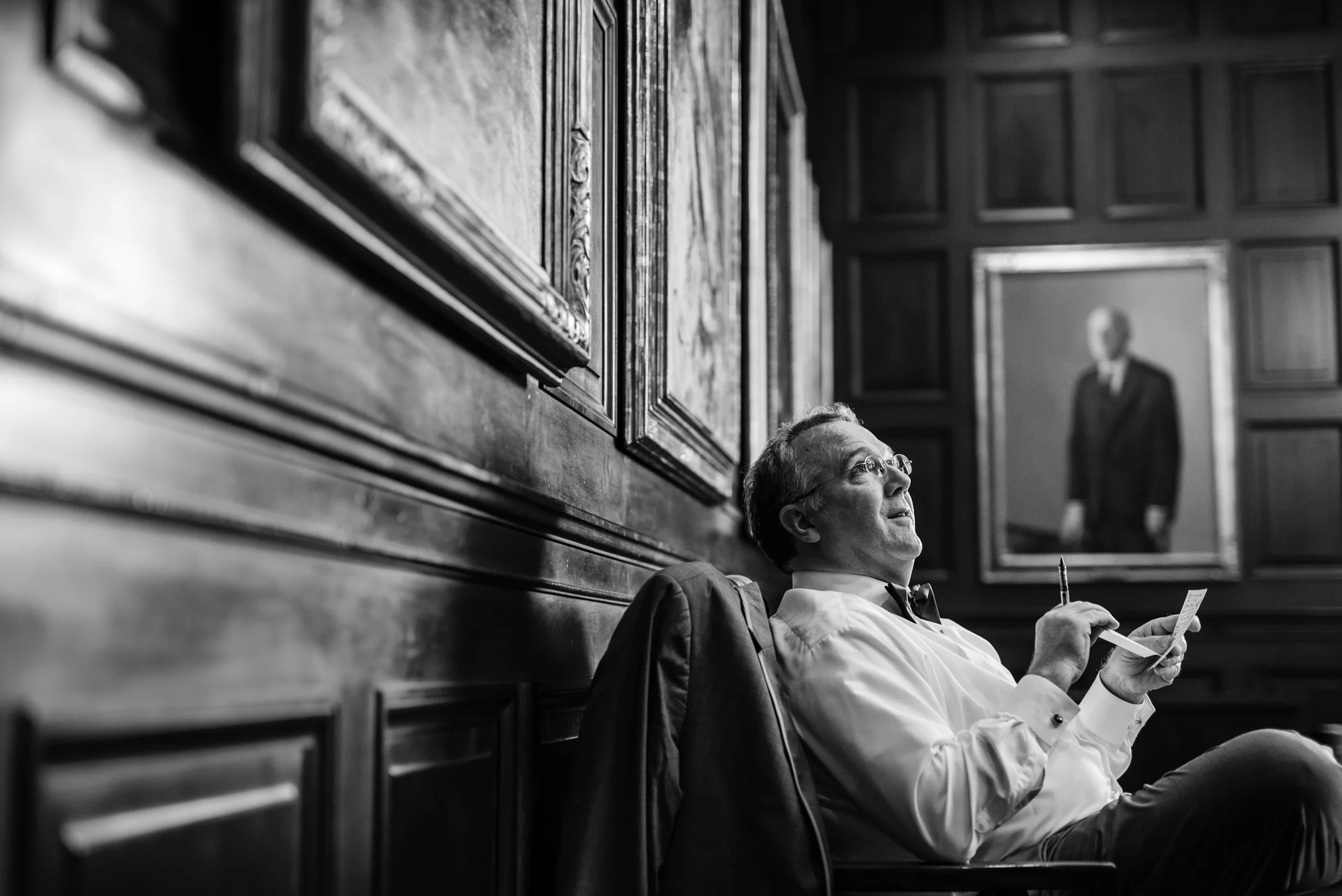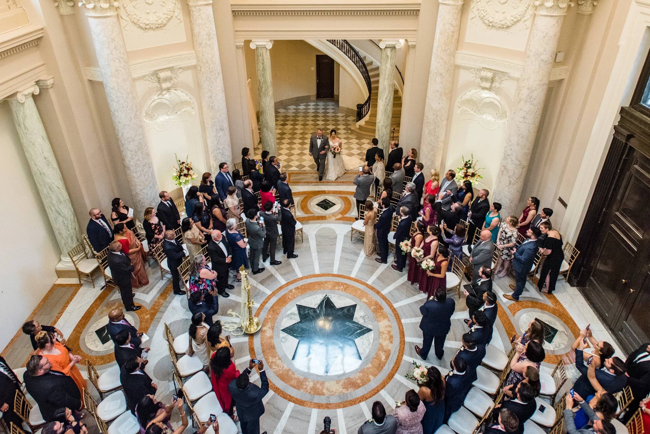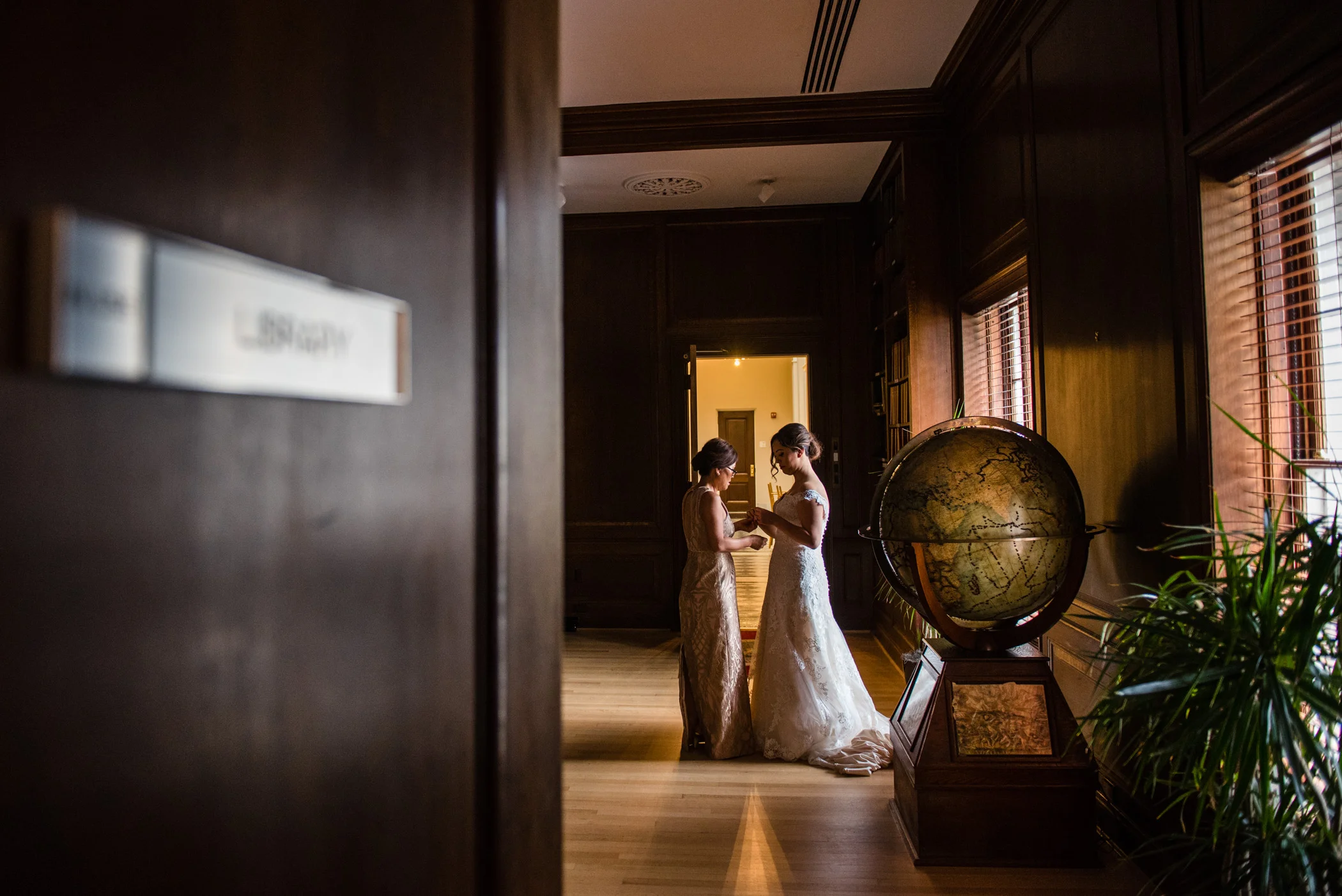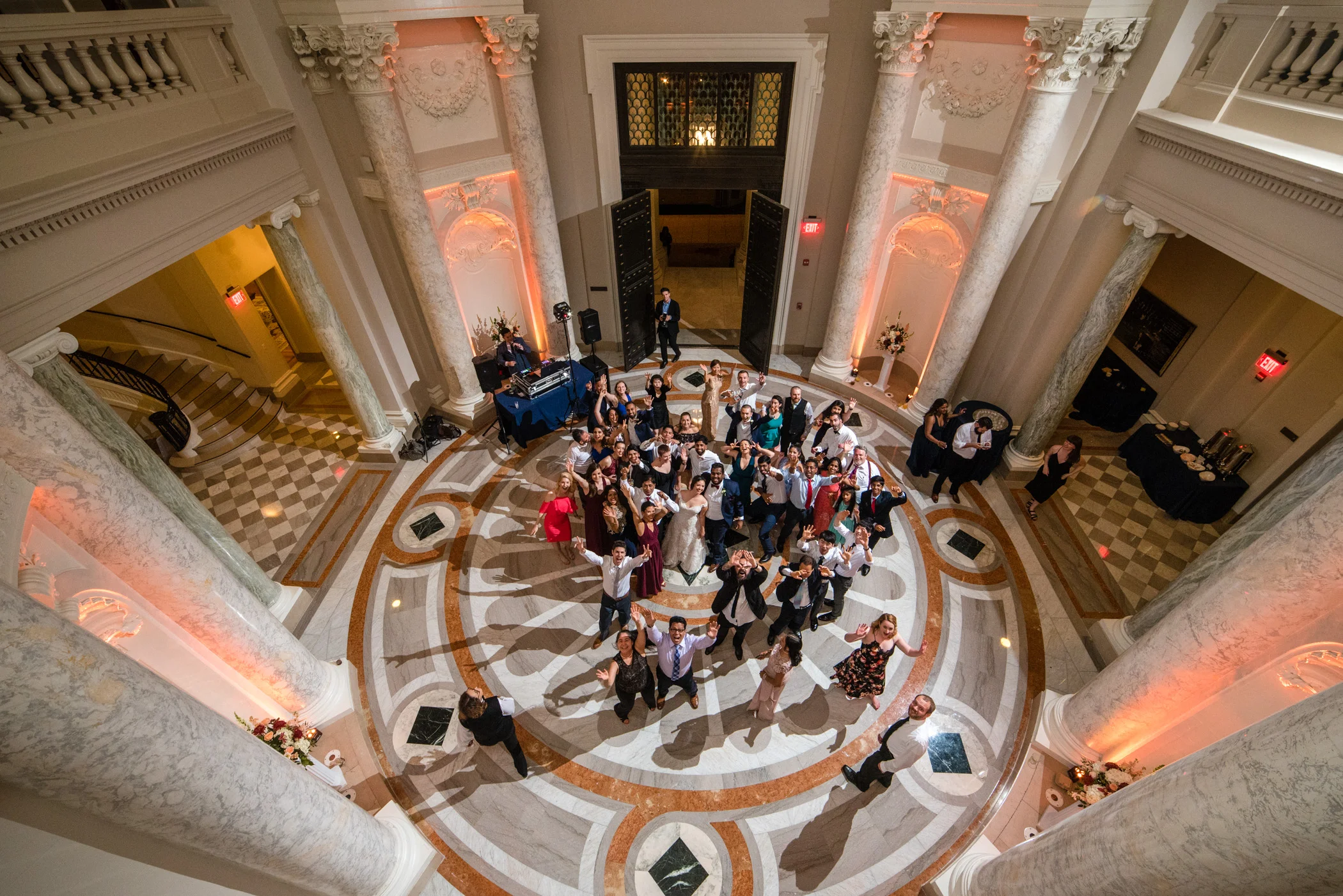 The Carnegie Institution is an extremely regal place with a circular rotunda area for the ceremony and reception dancing, as well as a dark, moody library where Sarah put on her dress. Both JJ and Sarah chose the venue in part because they loved the architecture, so we made a point to show that off throughout the day.