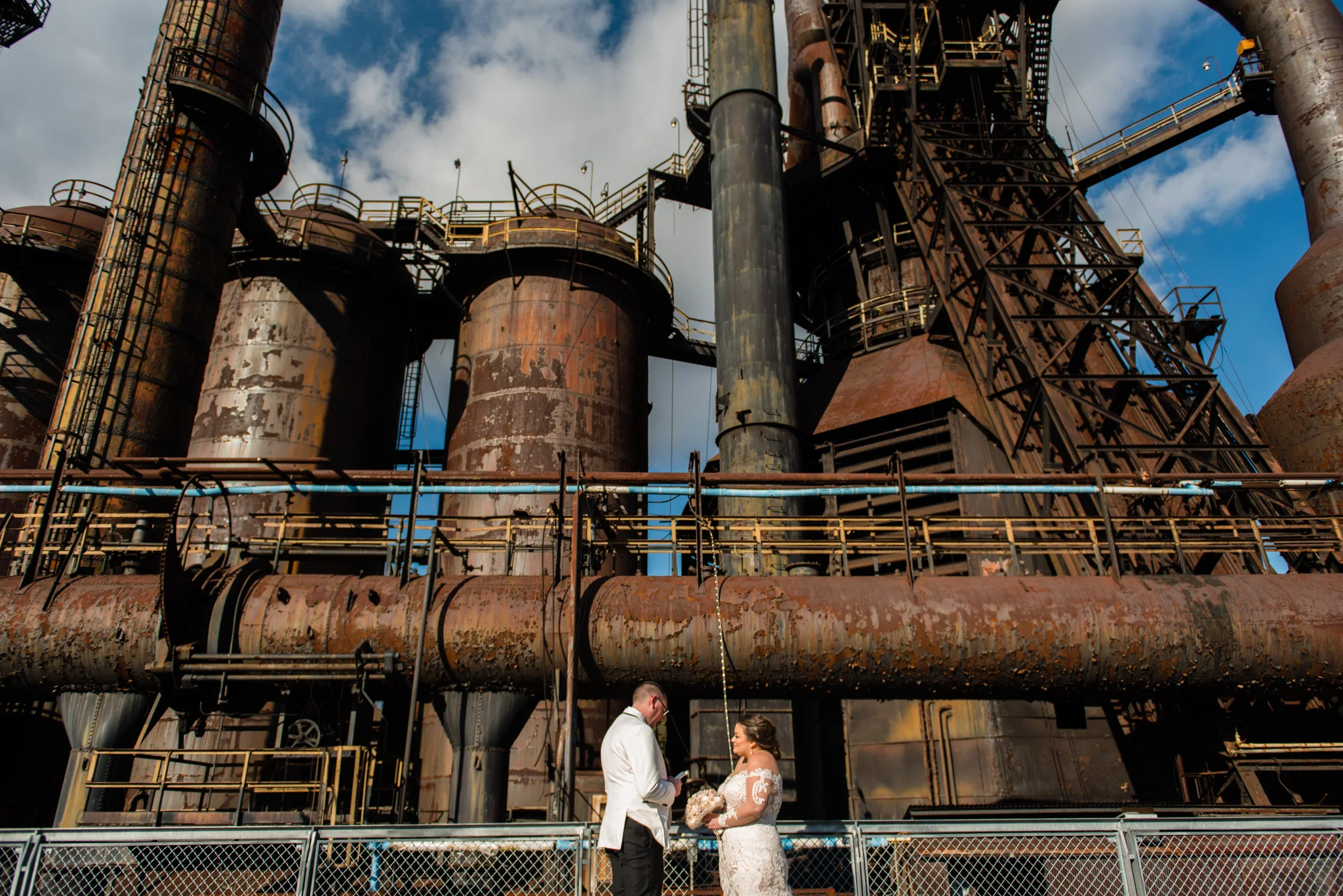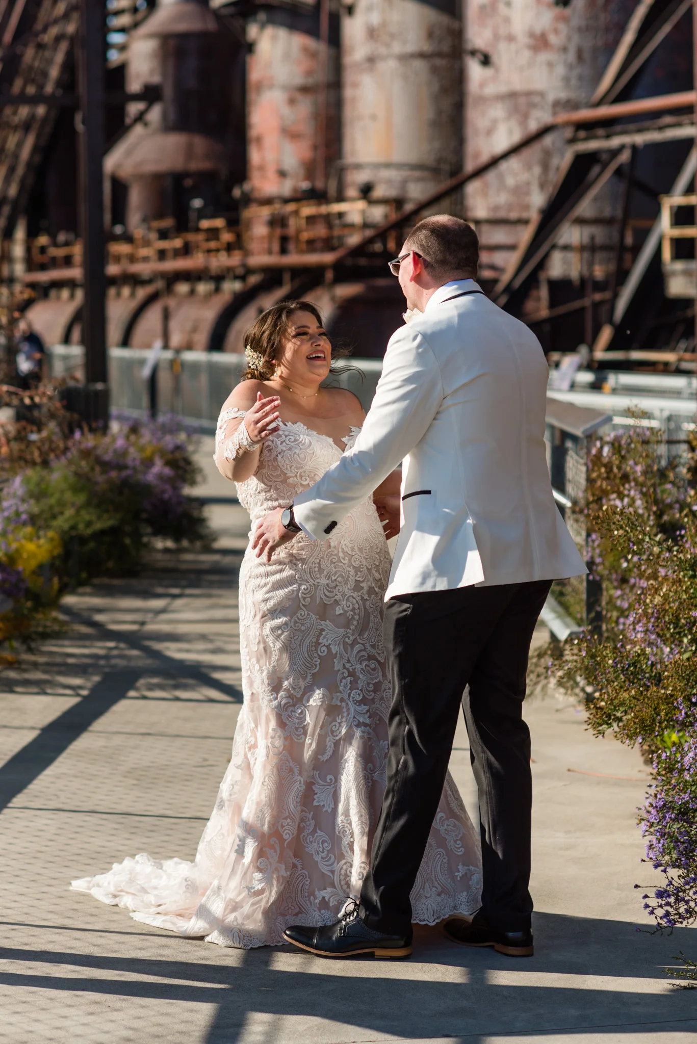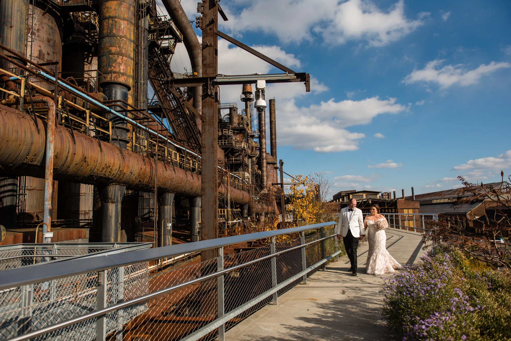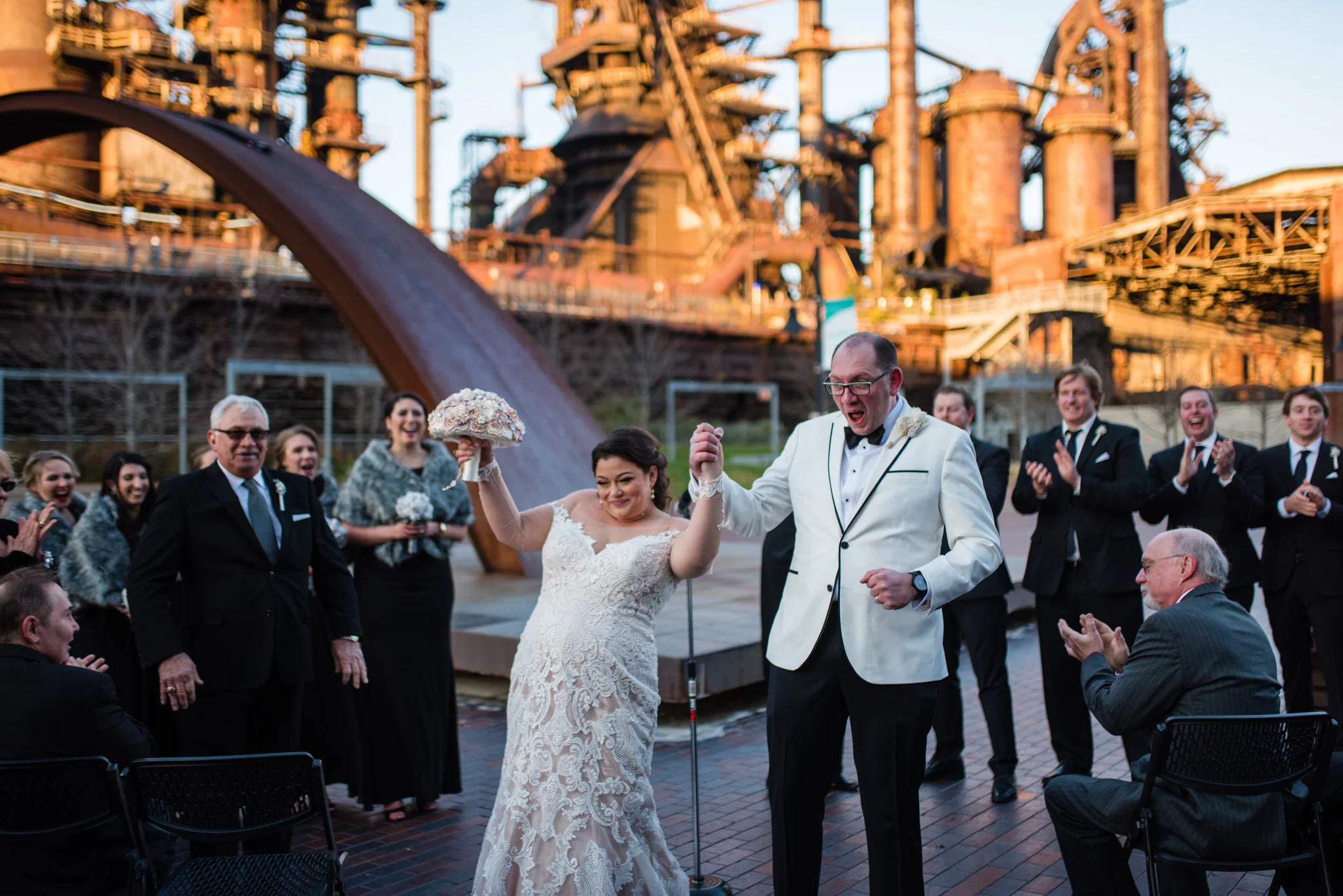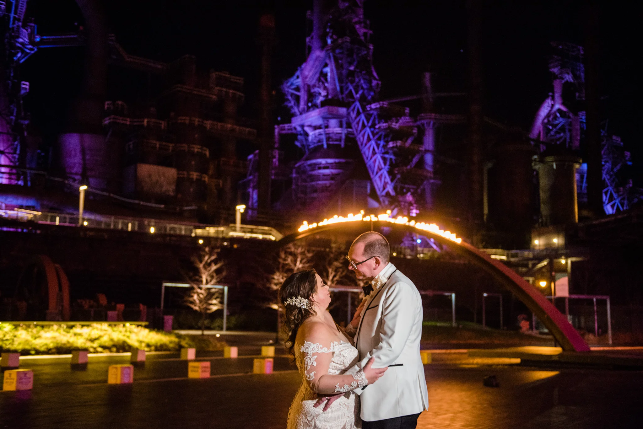 Megan grew up just minutes from the SteelStacks and shared that “being born and raised in Bethlehem, PA, a lot of the city’s pride is wrapped up in its history of producing steel for the country. The Brooklyn Bridge, Alcatraz, the Golden Gate Bridge, and many WWI and WWII ships were produced in my hometown. We both have an appreciation for that era of American industry, so we thought having our wedding at the SteelStacks with the old blast furnaces as our backdrop would be unique and very us.”