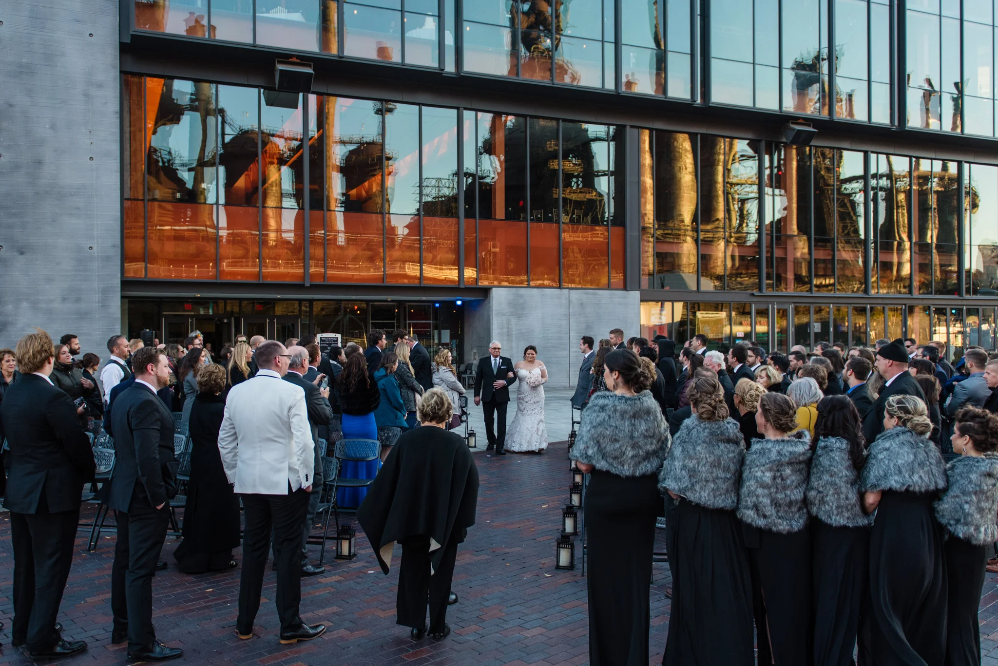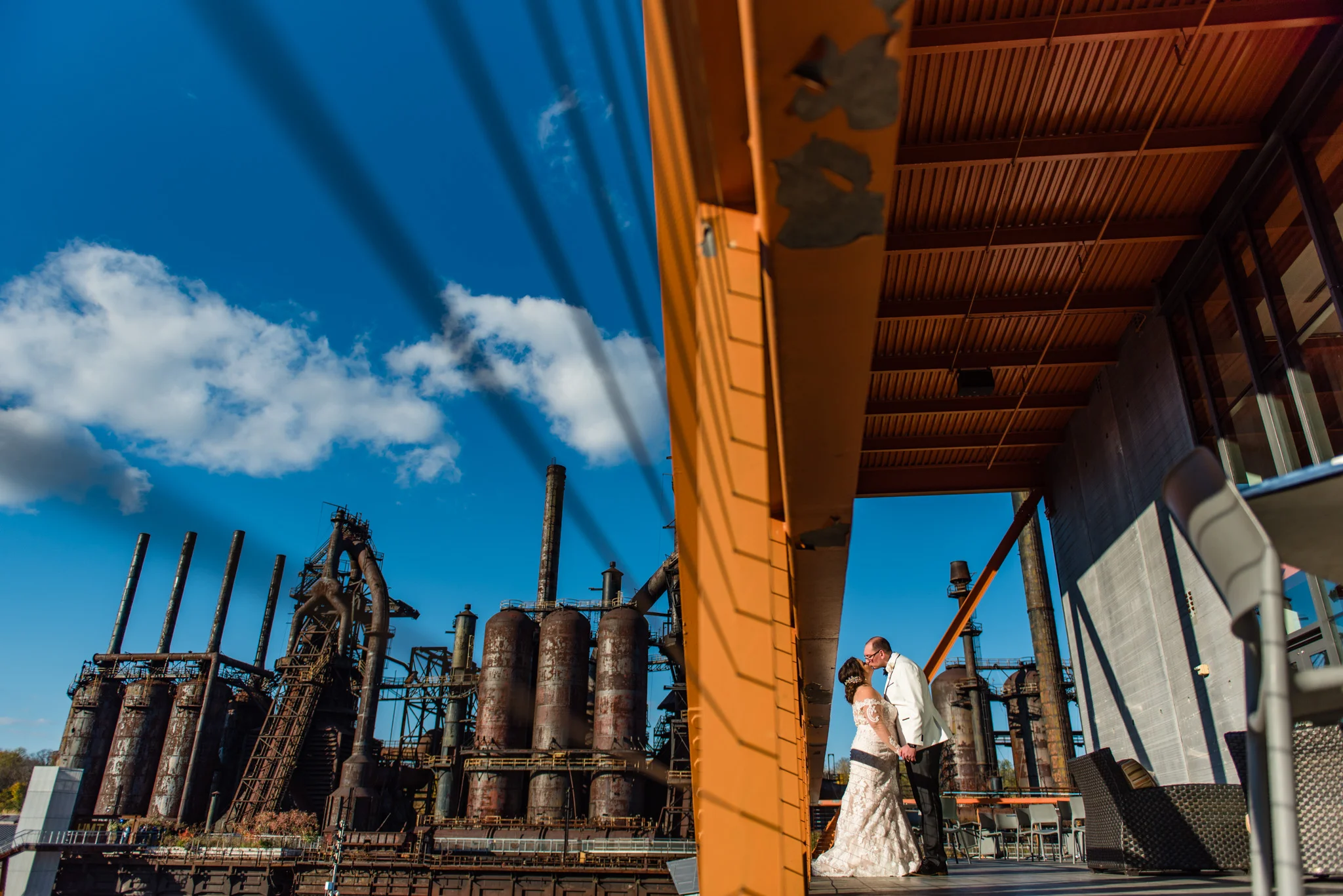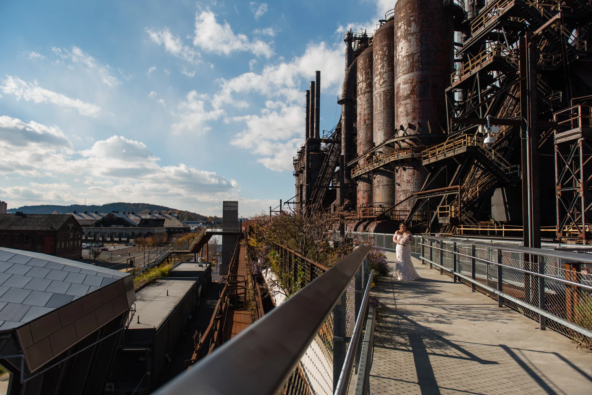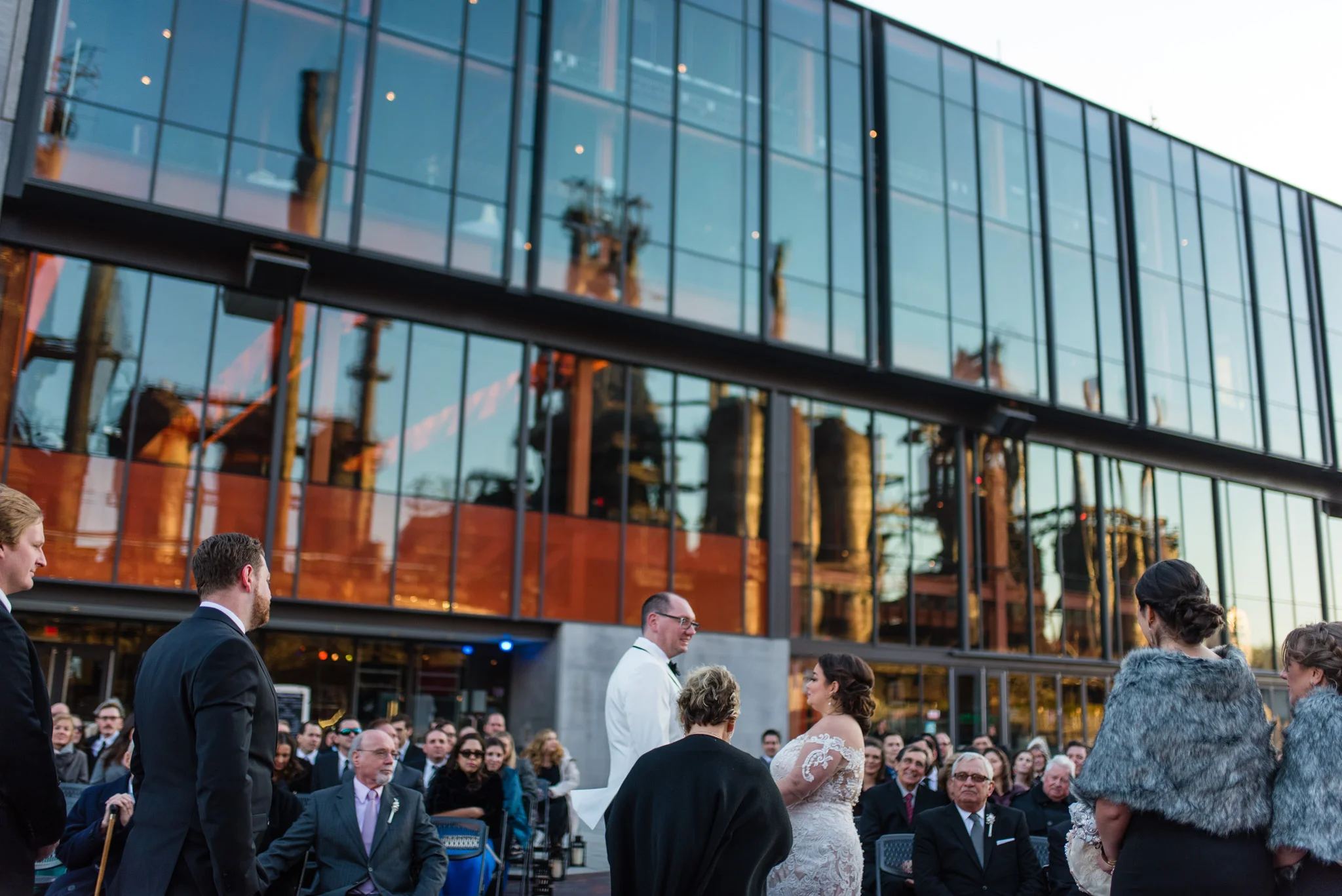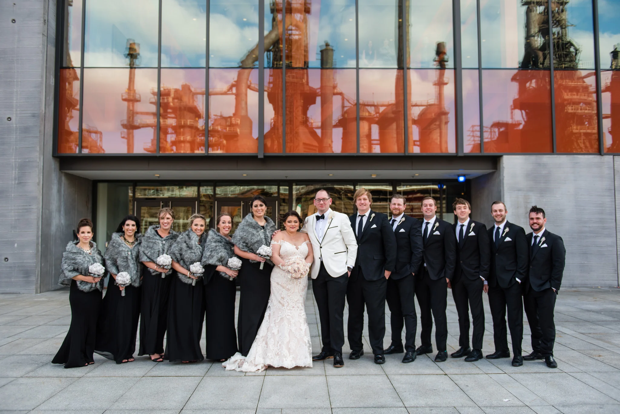 Megan grew up just minutes from the SteelStacks and shared that “being born and raised in Bethlehem, PA, a lot of the city’s pride is wrapped up in its history of producing steel for the country. The Brooklyn Bridge, Alcatraz, the Golden Gate Bridge, and many WWI and WWII ships were produced in my hometown. We both have an appreciation for that era of American industry, so we thought having our wedding at the SteelStacks with the old blast furnaces as our backdrop would be unique and very us.”