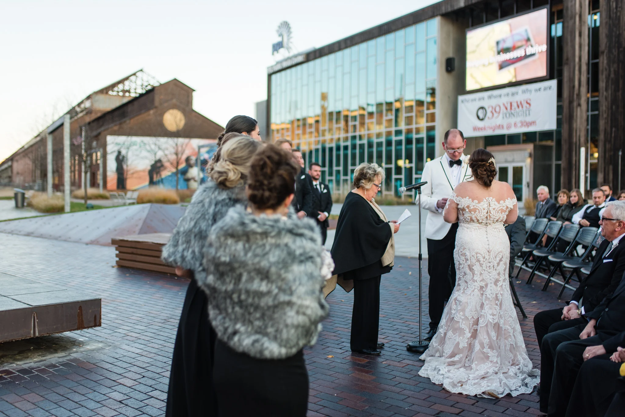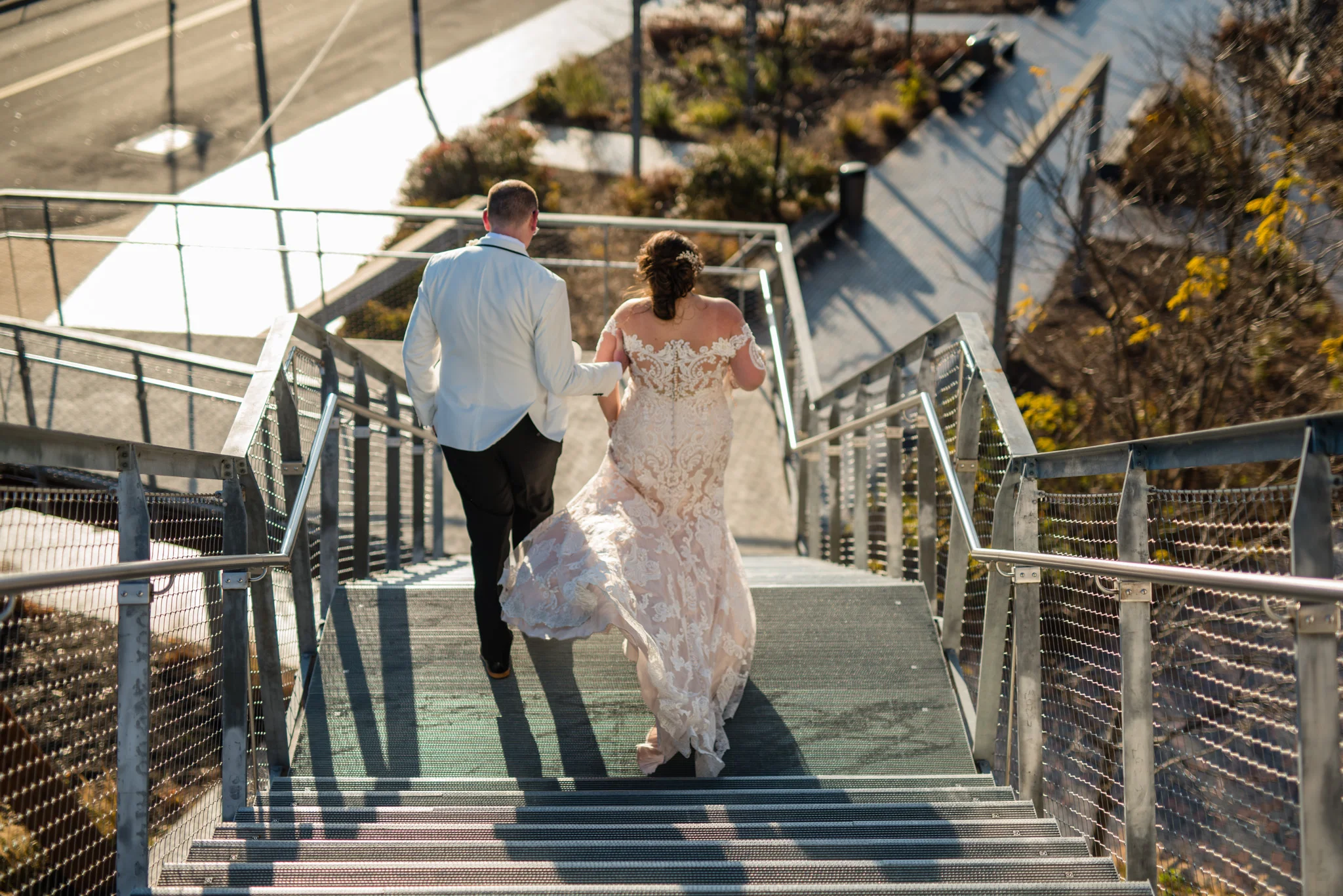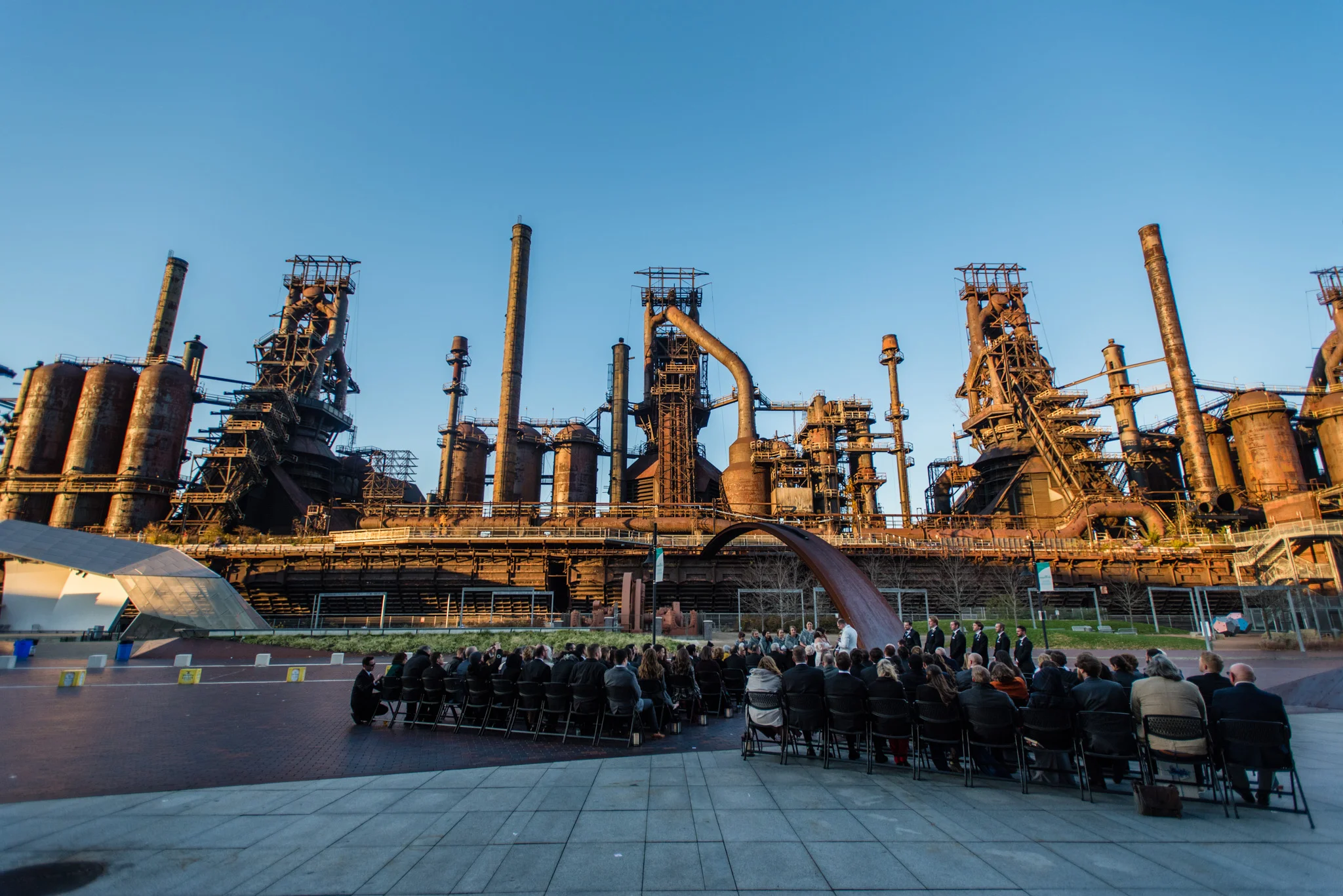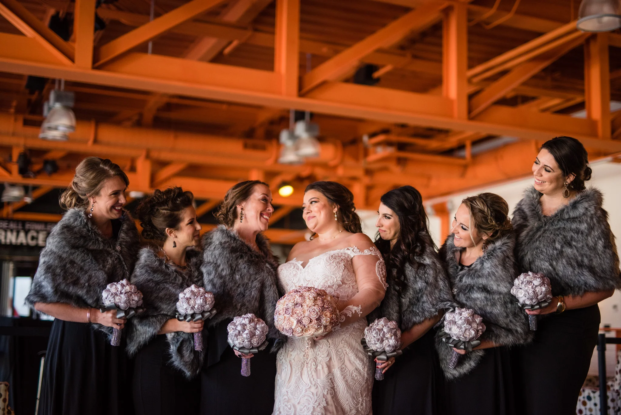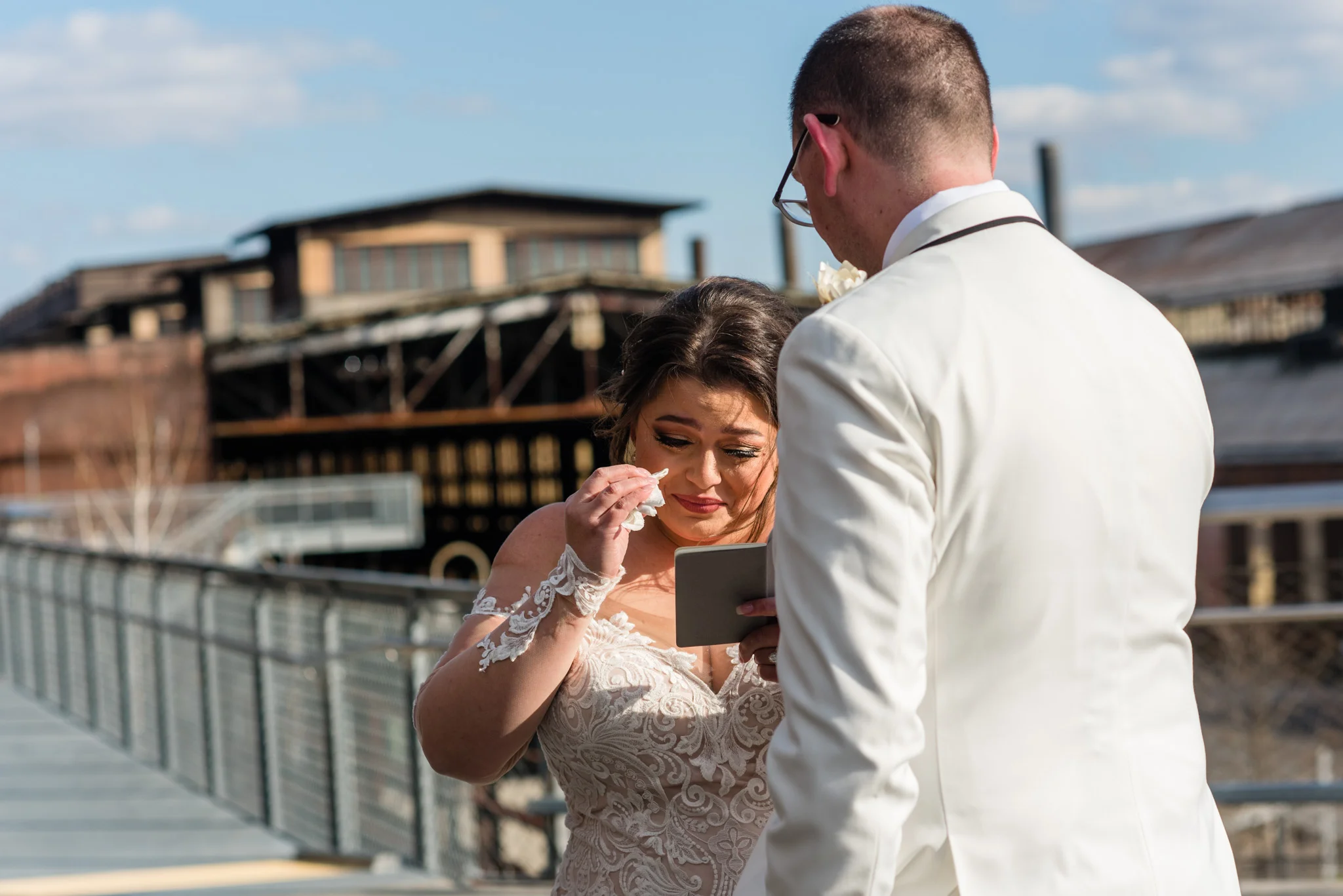 Megan grew up just minutes from the SteelStacks and shared that “being born and raised in Bethlehem, PA, a lot of the city’s pride is wrapped up in its history of producing steel for the country. The Brooklyn Bridge, Alcatraz, the Golden Gate Bridge, and many WWI and WWII ships were produced in my hometown. We both have an appreciation for that era of American industry, so we thought having our wedding at the SteelStacks with the old blast furnaces as our backdrop would be unique and very us.”